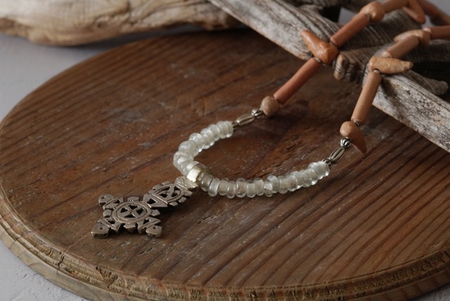印象的なクロスモチーフをポイントにしたロングネックレスです。 切絵で作ったような、いびつなクロスはコプトクロスと呼ばれるもの。 古代エジプトに起源をもち、原始のキリスト教の名残を留めるコプト正教は 現代でもエチオピアを中心に信者が存在しているそうです。 コプトクロスは身に着けるために、ひとつひとつ職人の手により作られています。 コプトクロスの素朴な美しさを際立たせるように 透明なガラスのビーズをメインに使用してロングネックレスに仕立てました。 空気を含んだような、いびつなガラスビーズはインドネシアのもの。 途中に不ぞろいな水晶を挟み、透明が単調になりすぎないようにしたのもポイントです。 両側に加えたのはしっとりとした駱駝の骨と貝のビーズ。 自然物ならではの、あたたかみのある質感で全体をナチュラルな雰囲気にしています。 存在感があるので、シンプルなコーディネートに加えてお楽しみ頂けるネックレスです。 <サイズ> ネックレス:全長約69.5cm クロス:40×30mm <素材> 真鍮、合金、ガラス、水晶、貝、骨 NO.2512-09