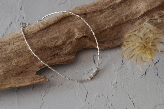 小さなカレンシルバーの粒を主役にしたシンプルなブレスレットです。 きらきらと輝く砂粒のように小さなカレンシルバーを連ね、ポイントにはそれよりも少し大きなカレンシルバーを加えました。 ランダムに、キューブに近い形でカットされたシルバーは重なることでうねるような動きを見せます。 一粒一粒に手作りならではのやわらかさが感じられ、きらきらと光を反射する様がとてもきれいです。 手首につけると、ぽっと燈火が灯るようにやさしい輝きを宿します。 留め具の部分にはサークル型の金具を連ねていますのでお好みで長さを調整していただけます。 <サイズ> 約16.5/17.3/17.8 cmに調整可能 留め位置により3段階に調整できます。 <素材> 真鍮、カレンシルバー、カレンシルバー(18KGP) 【カレンシルバーとは】 タイ北部からミャンマーにかけて暮らす山岳民族であるカレン族の職人が作る銀製品で純度が95%と高いため少し柔らかく、 光を宿したような色合いと繊細な美しさを秘めているのが特徴です。 銀製品は性質上、しばらく放置していると黒ずみが発生してしまいます。 この黒ずみは硫黄分に反応して起きる硫化が原因です。 硫黄は空気中や、人の皮脂に含まれるタンパク質の成分内にも存在します。 変色を防ぐためには、セーム革や柔らかい布等でこまめに汚れを落とし、 チャック袋等でなるべく空気に触れないように保管するのがおすすめです。 黒ずみが気になる場合は、シルバー用クロスでお手入れすると輝きが戻ります。 ◆シルバーカラーはこちら NO.2512-07