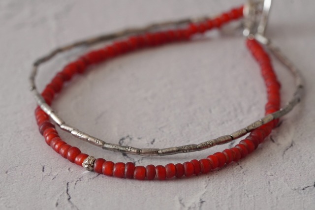 幼い頃、大切に宝箱に入れていたビーズのアクセサリーをモチーフにしたブレスレットです。 きらきら光る小さなものが大好きだった子供のころ、 ビーズを集めてプラスチックのケースに閉じ込め、シャカシャカと振ってみたり、蓋を開けて外に出してみたり、じっと眺めていた記憶があります。 ある日母が出かけた帰り、カラフルなビーズのネックレスをお土産に買ってきてくれたのがう嬉しくて、貝の貼ってある宝箱に入れていました。 大人になり家を出て、しばらく忘れていましたが 記憶の中のアクセサリーに似た色のビーズを見つけ、思い出を辿るように作ってみることにしました。 赤いビーズはヴィンテージのガラスビーズ。 ホワイトハーツと呼ばれるネイティブジュエリー等にも使われるビーズで、白い芯の上から赤いガラスの層が被せてあります。 この二重構造により発色が鮮やかになることが特徴ですが、こちらのビーズは柘榴の実のような落ち着いたトーンの赤色がとても上品です。 ガラスビーズの中心にはカレンシルバーをプラスして大人が着けても違和感のないようにしました。 また花の刻印のあるカレンシルバーを二重にしているので、細いブレスレットではありますが存在感もあります。 <サイズ> 全長:約17/17.7cm ※マンテルの棒を通すリングを2つ着けているので、長さを調整していただけます。 <素材> 真鍮、ガラス(ヴィンテージ)、カレンシルバー ※ビーズは様々な大きさ・色・模様が混ざっているため、個体差があります。 【カレンシルバーとは】 タイ北部からミャンマーにかけて暮らす山岳民族であるカレン族の職人が作る銀製品で純度が95%と高いため少し柔らかく、 光を宿したような色合いと繊細な美しさを秘めているのが特徴です。 銀製品は性質上、しばらく放置していると黒ずみが発生してしまいます。 この黒ずみは硫黄分に反応して起きる硫化が原因です。 硫黄は空気中や、人の皮脂に含まれるタンパク質の成分内にも存在します。 変色を防ぐためには、セーム革や柔らかい布等でこまめに汚れを落とし、 チャック袋等でなるべく空気に触れないように保管するのがおすすめです。 黒ずみが気になる場合は、シルバー用クロスでお手入れすると輝きが戻ります。 NO.2512-10