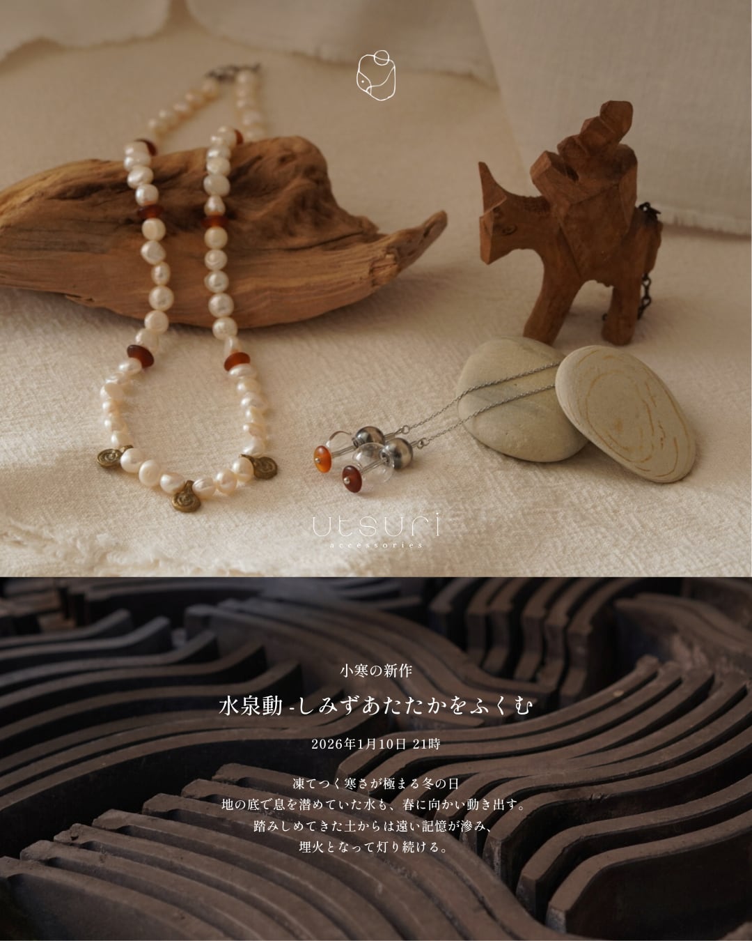 気温の冷え込む冬の朝、雲から溢れる霰を集め、連ねたようなショートネックレスです。 雪の結晶が雲を通り抜けるとき、水滴を纏わせ塊になり、ぱらぱらと音を立てながら落ちてくる。丸く小さな白い粒は、「たまあられ」と呼ばれています。 冬の季語、玉霰を思わせるやわらかな白色の淡水パールと飴色の水牛角を組み合わせ ポイントに花びらのような形をしたインドの真鍮製パーツを配しました。 上品すぎず、普段着にもカジュアルに合わせられてポイントになるネックレスです。 不規則な形のパールがぬくもりある印象を与えてくれます。 <サイズ> 約46.5cm <素材> 真鍮、淡水パール、水牛角 ※天然素材は形や色、大きさ等がそれぞれ異なります。天然ならではの風合いとしてご理解ください。 NO.2512-04