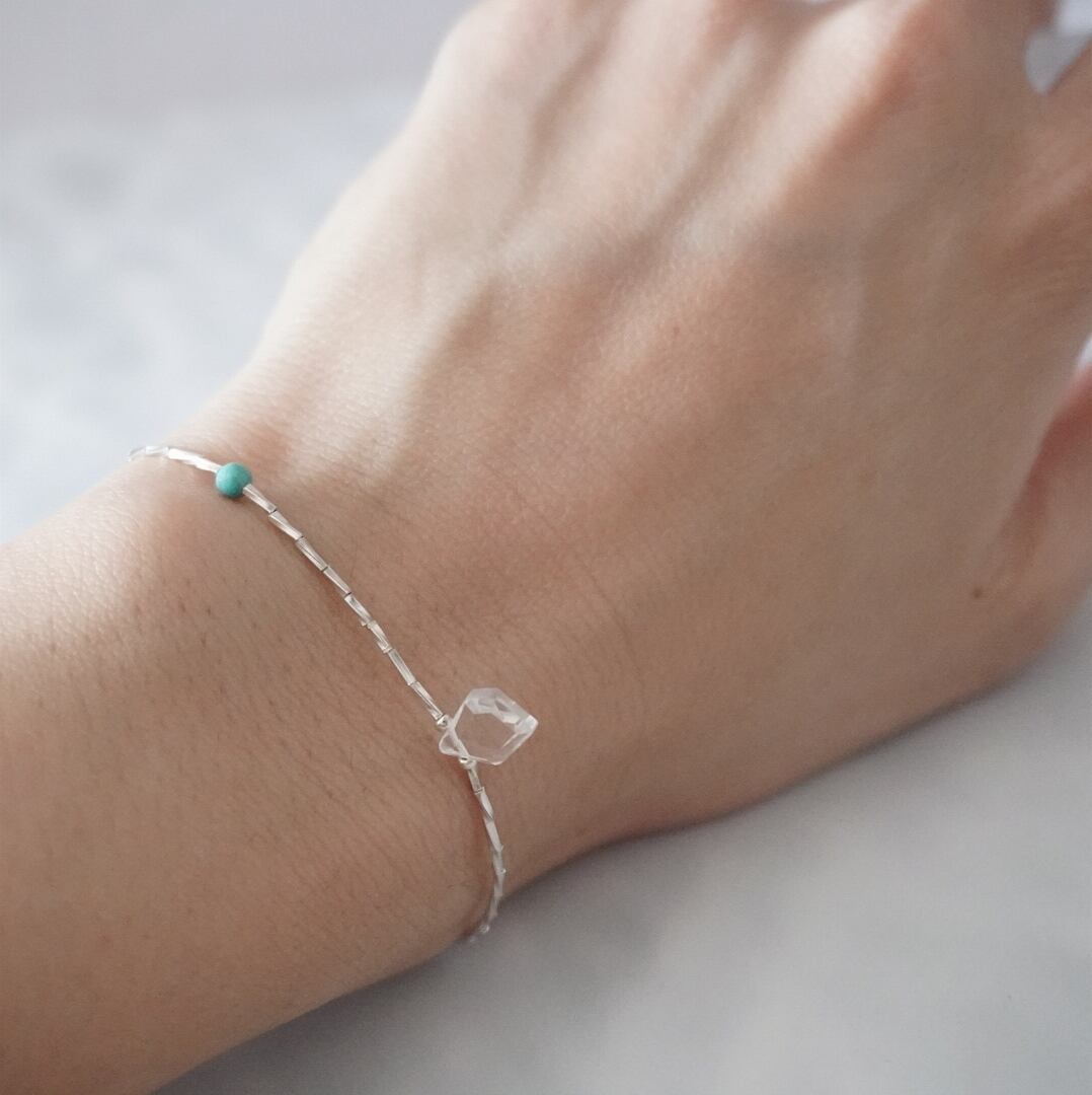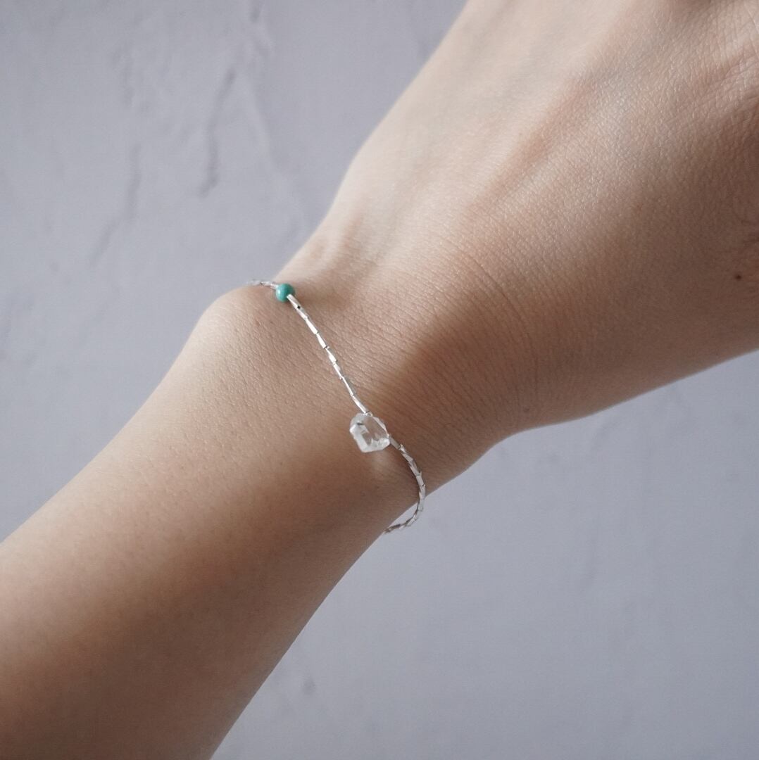 やさしく光るカレンシルバーを連ね、透明な水晶と明るい海の色をしたターコイズをポイントにしたブレスレットを製作しました。