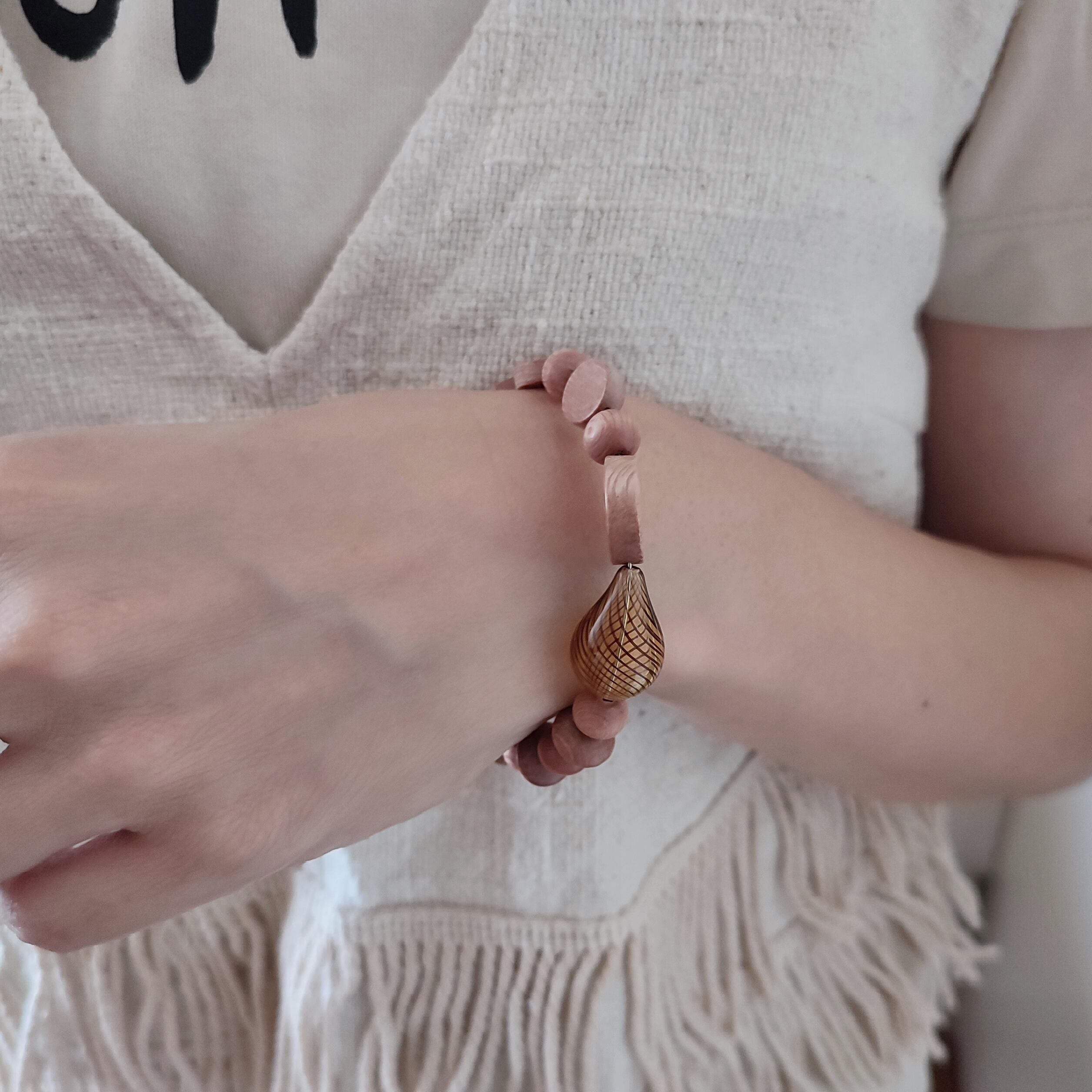 木をメインに使い、すべすべした質感を楽しめるようなブレスレットを製作しました。