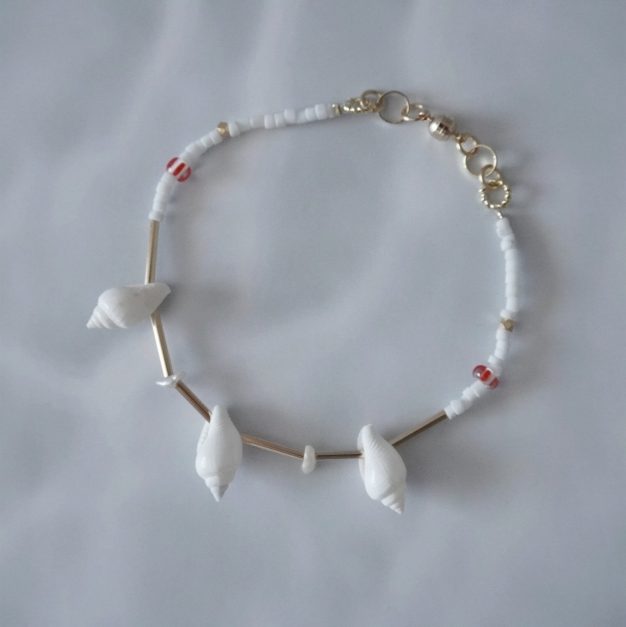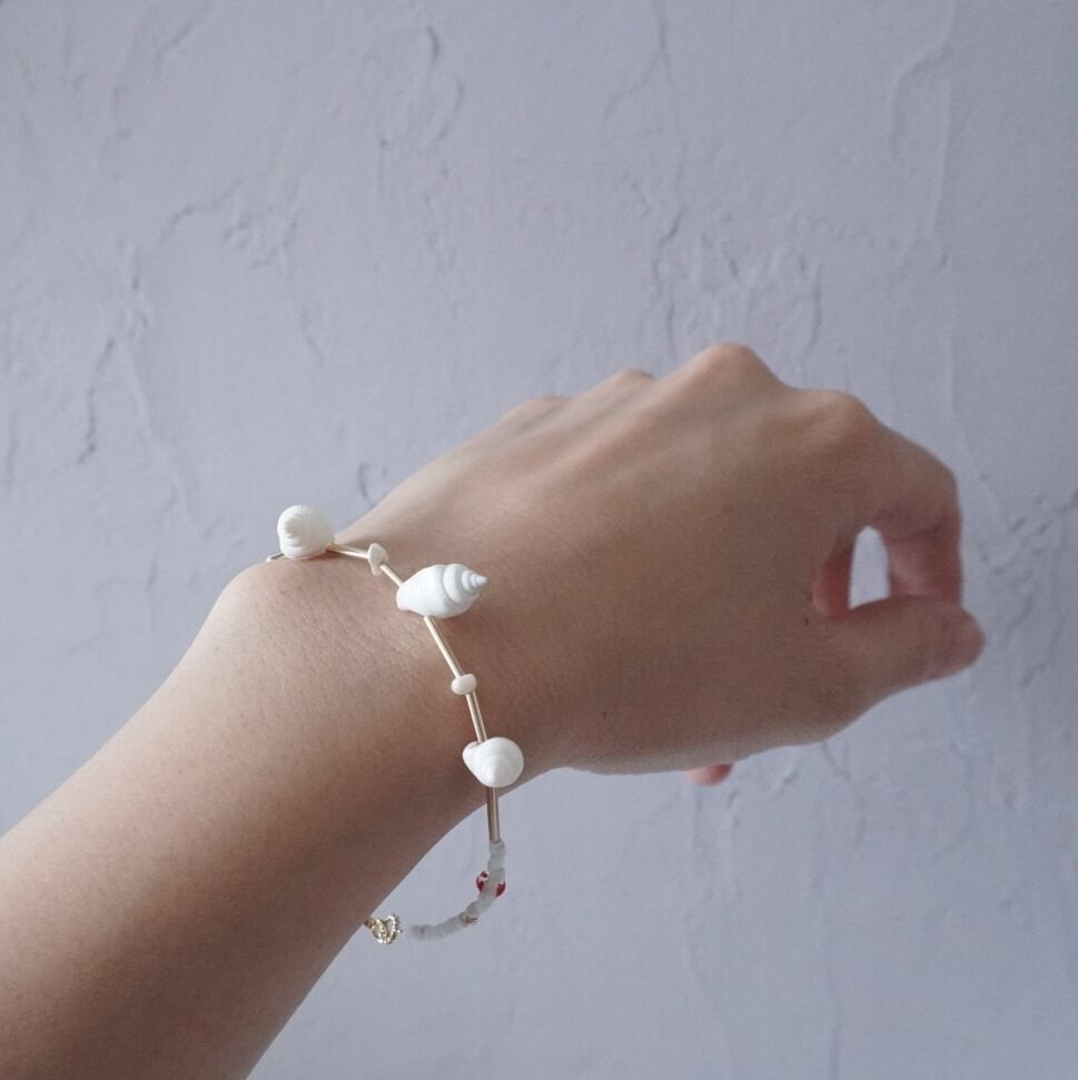 小さな巻貝を3つ並べた、夏の海をイメージしたブレスレットです。