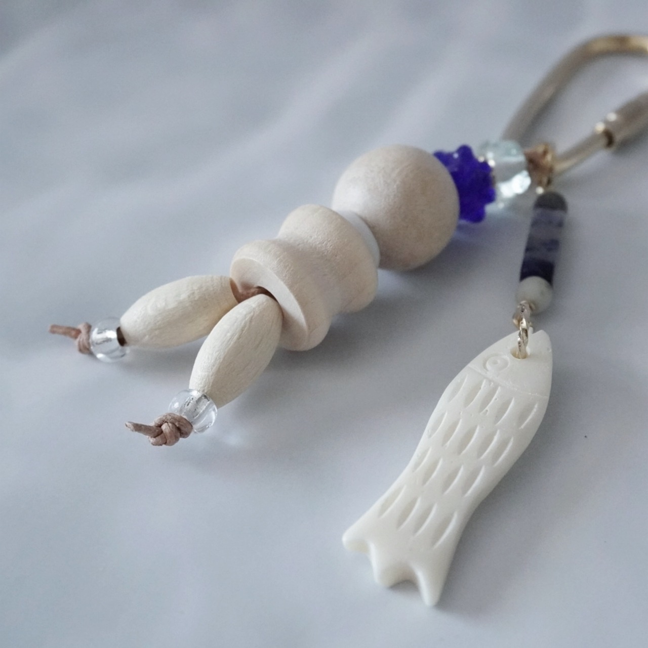 丸い目をした白い魚は、水牛の骨を素材にしたもの。