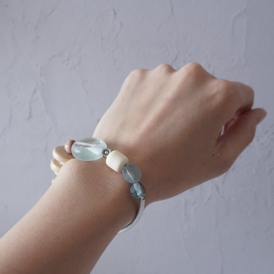 つるっとしたチェコガラスなどを組み合わせたブレスレットです。