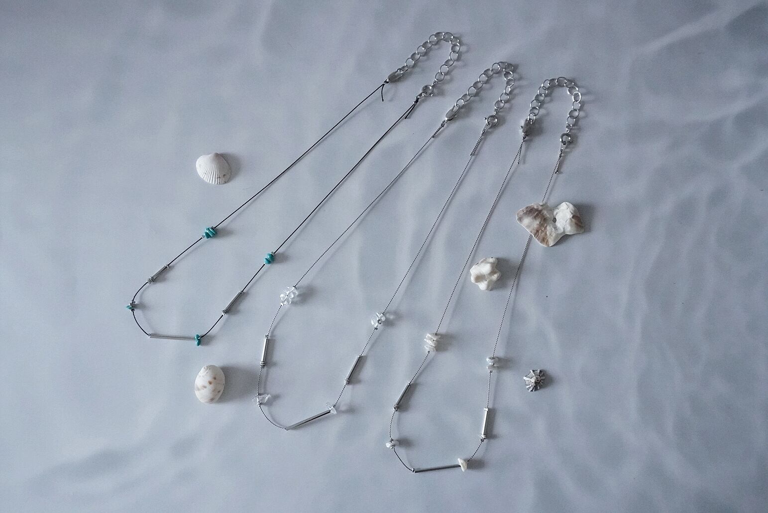 これからの季節にはシンプルなノースリーブの首元やラフなTシャツに着けても素敵です。