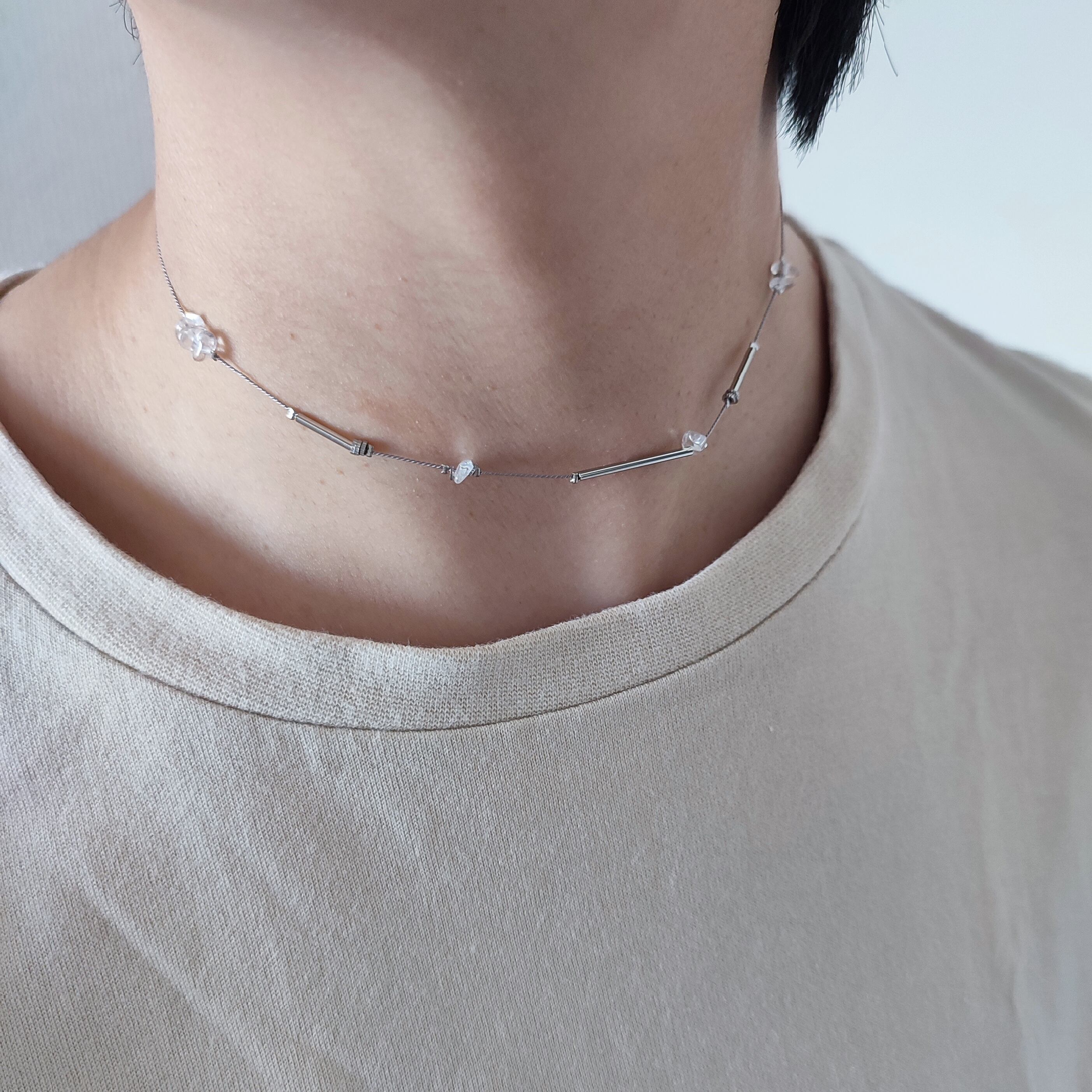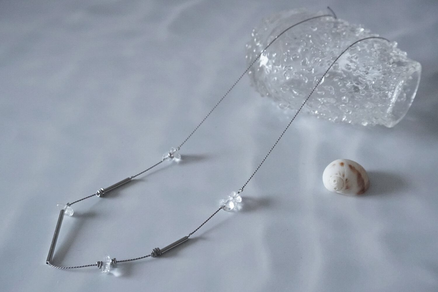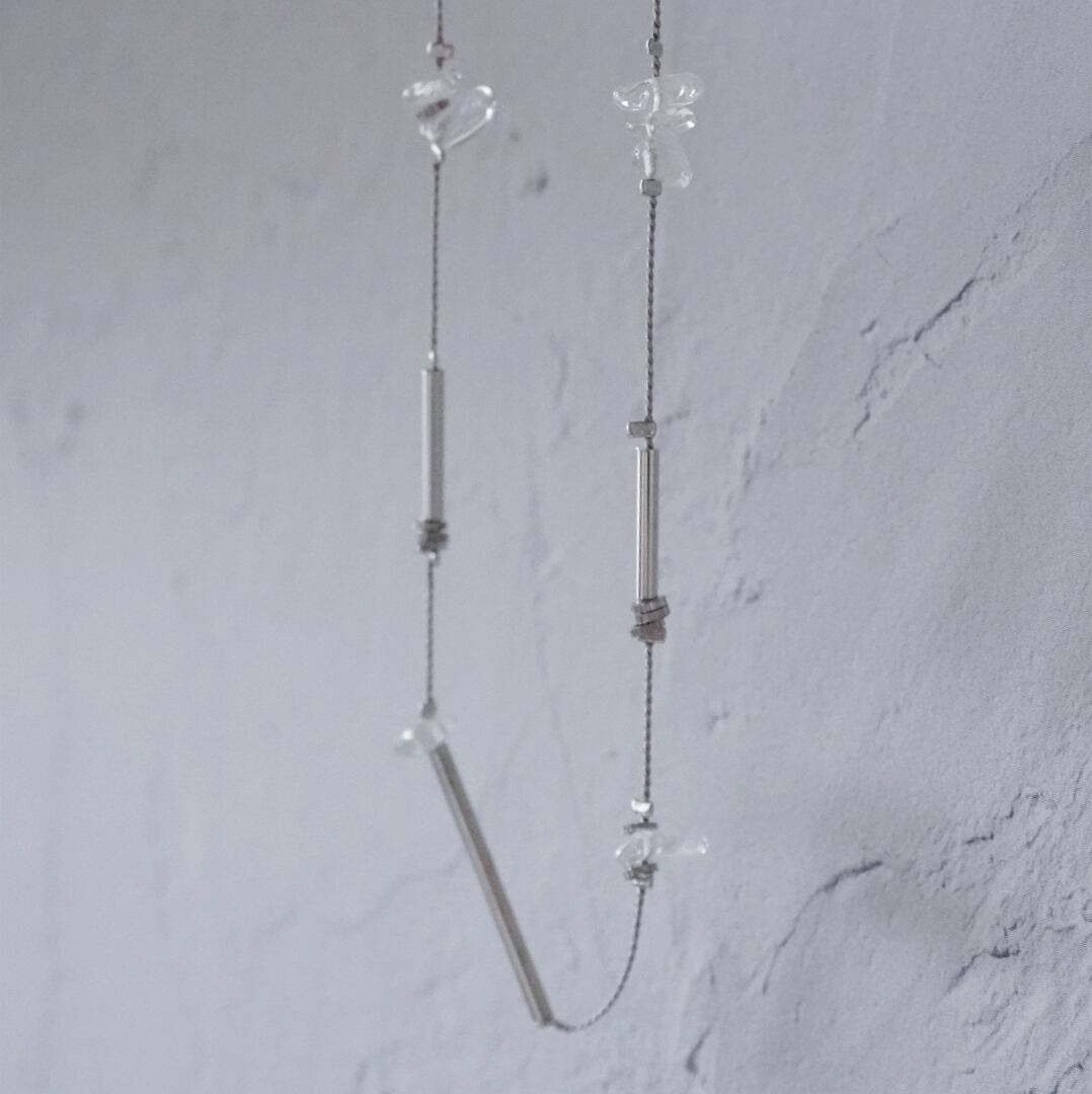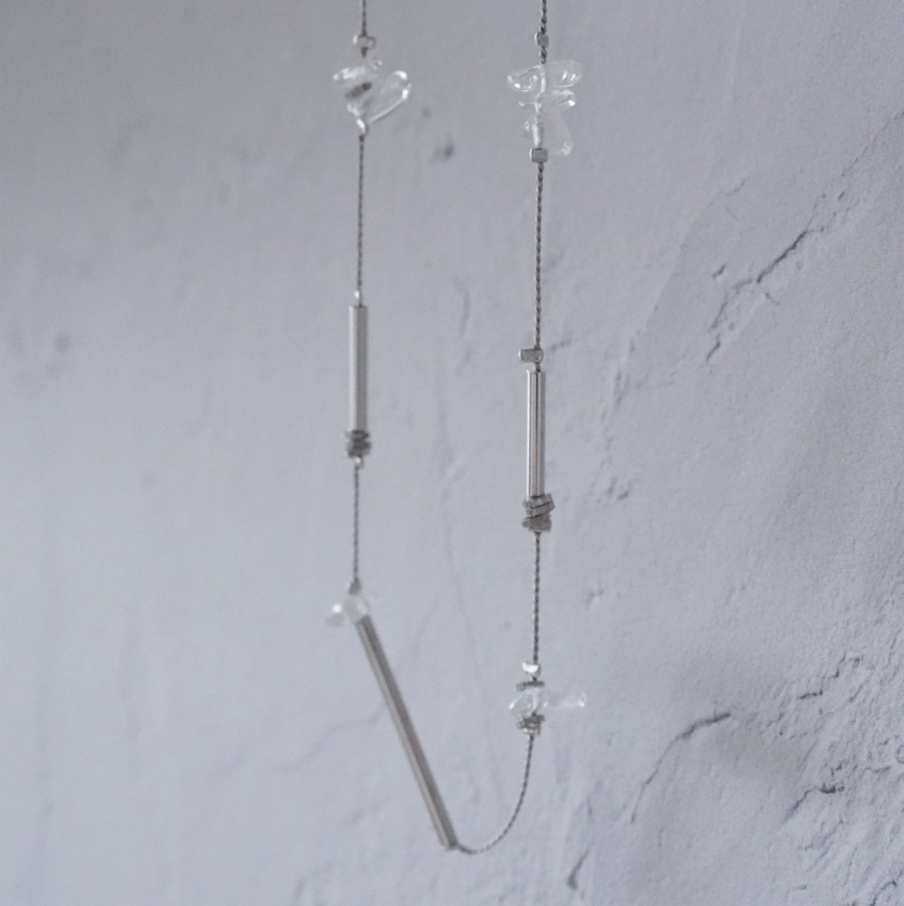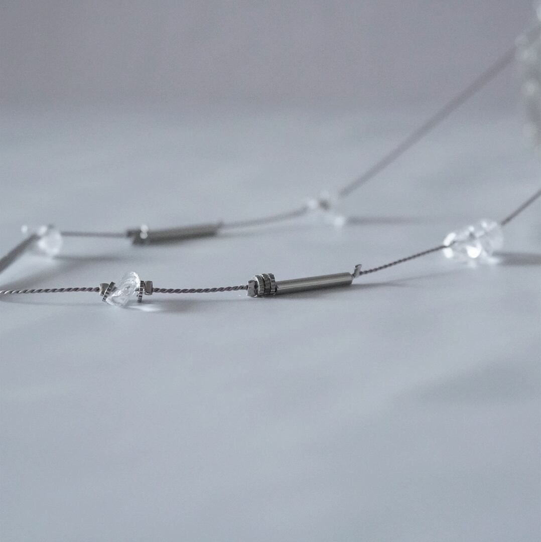 透明な水晶の粒を細くしなやかな灰色のシルク糸でつないだショートネックレスです。