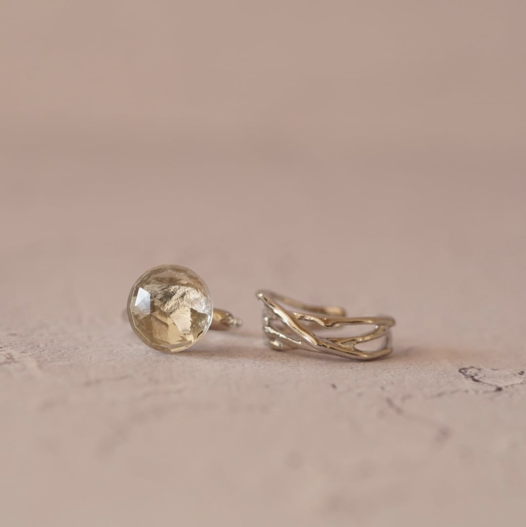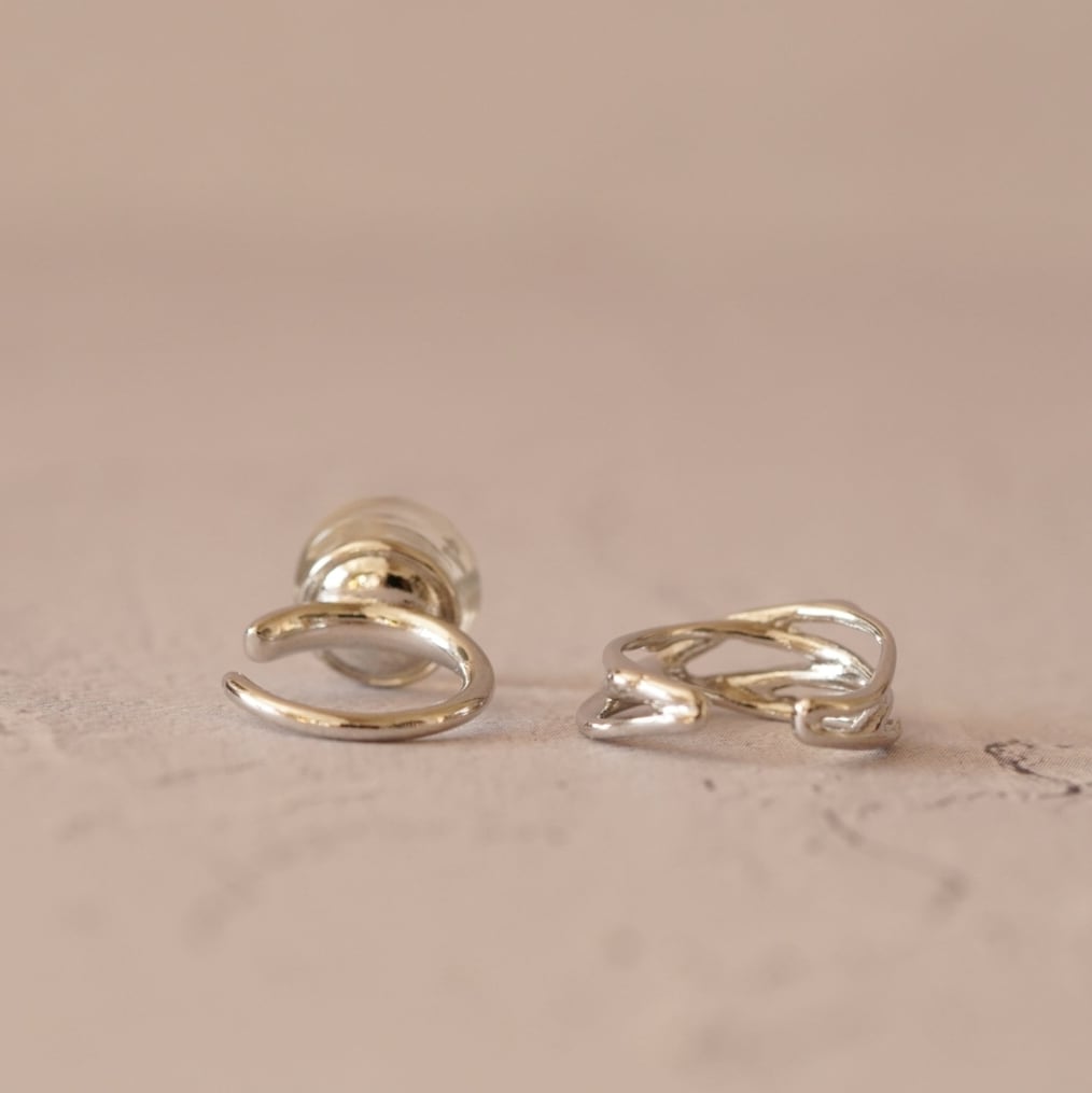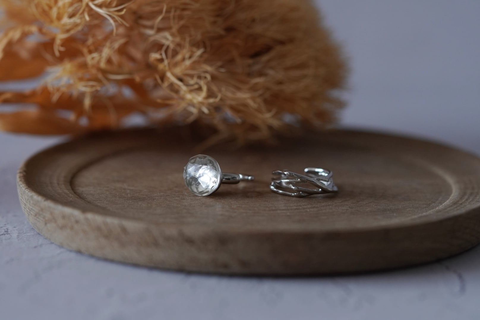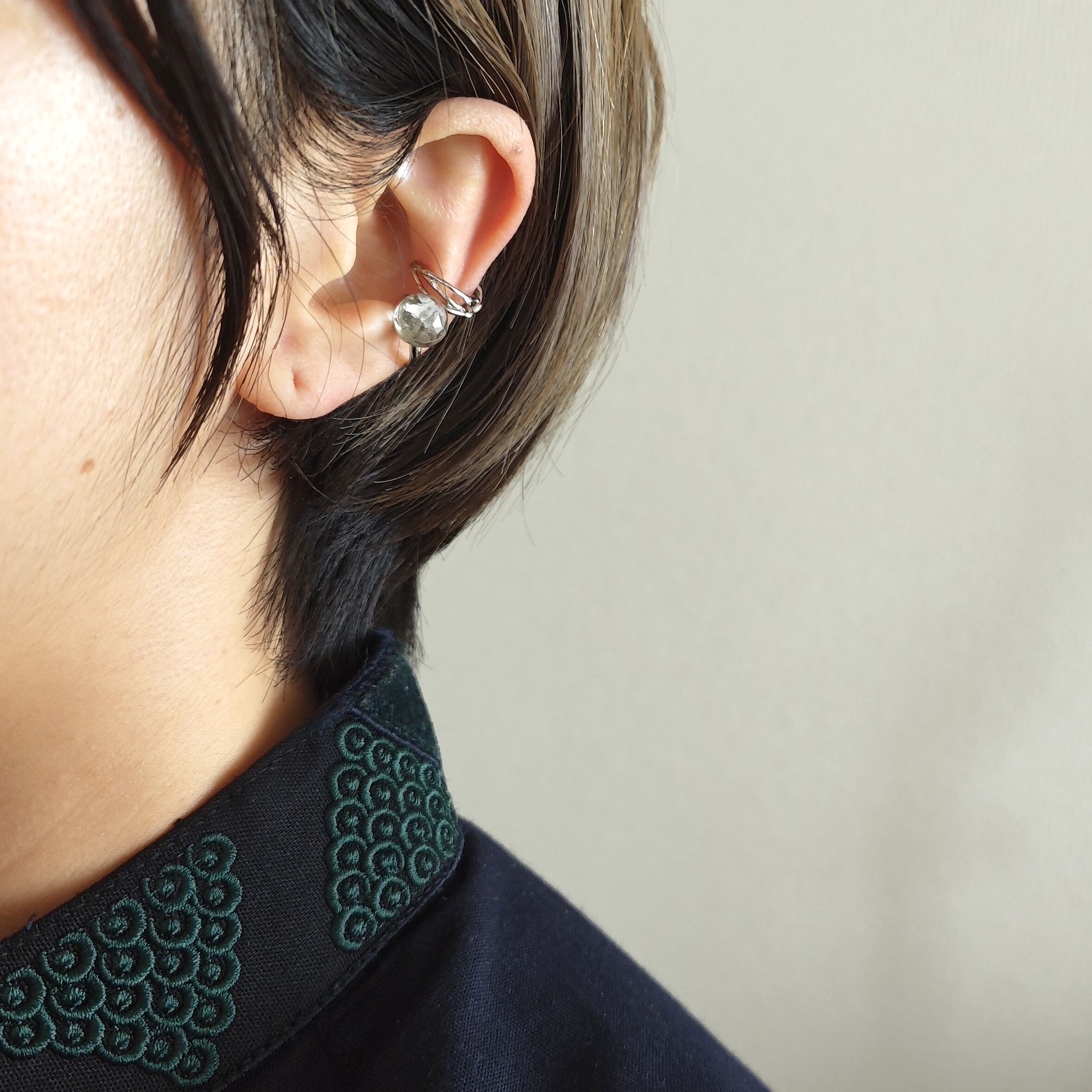 石の対となるのは木の枝を思わせるシンプルなシルバーカラーのイヤーカフ。