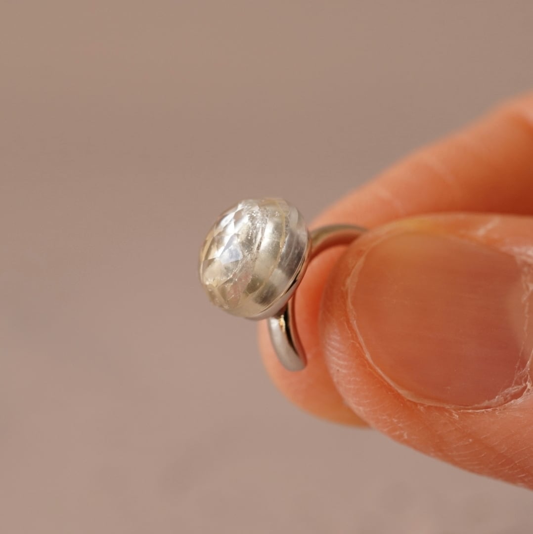 金属のベース部分はシルバーカラーなので、カットの施された水晶に光が射すと