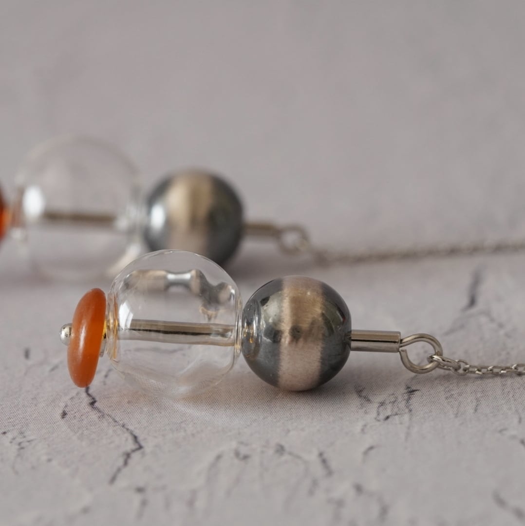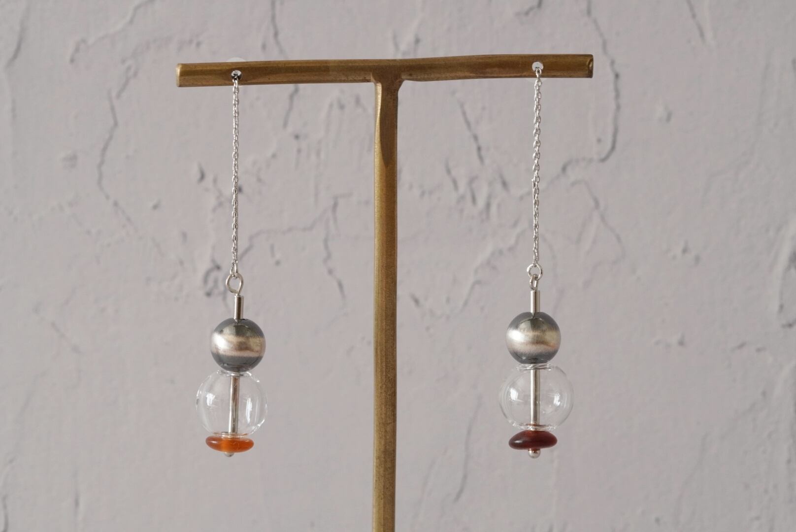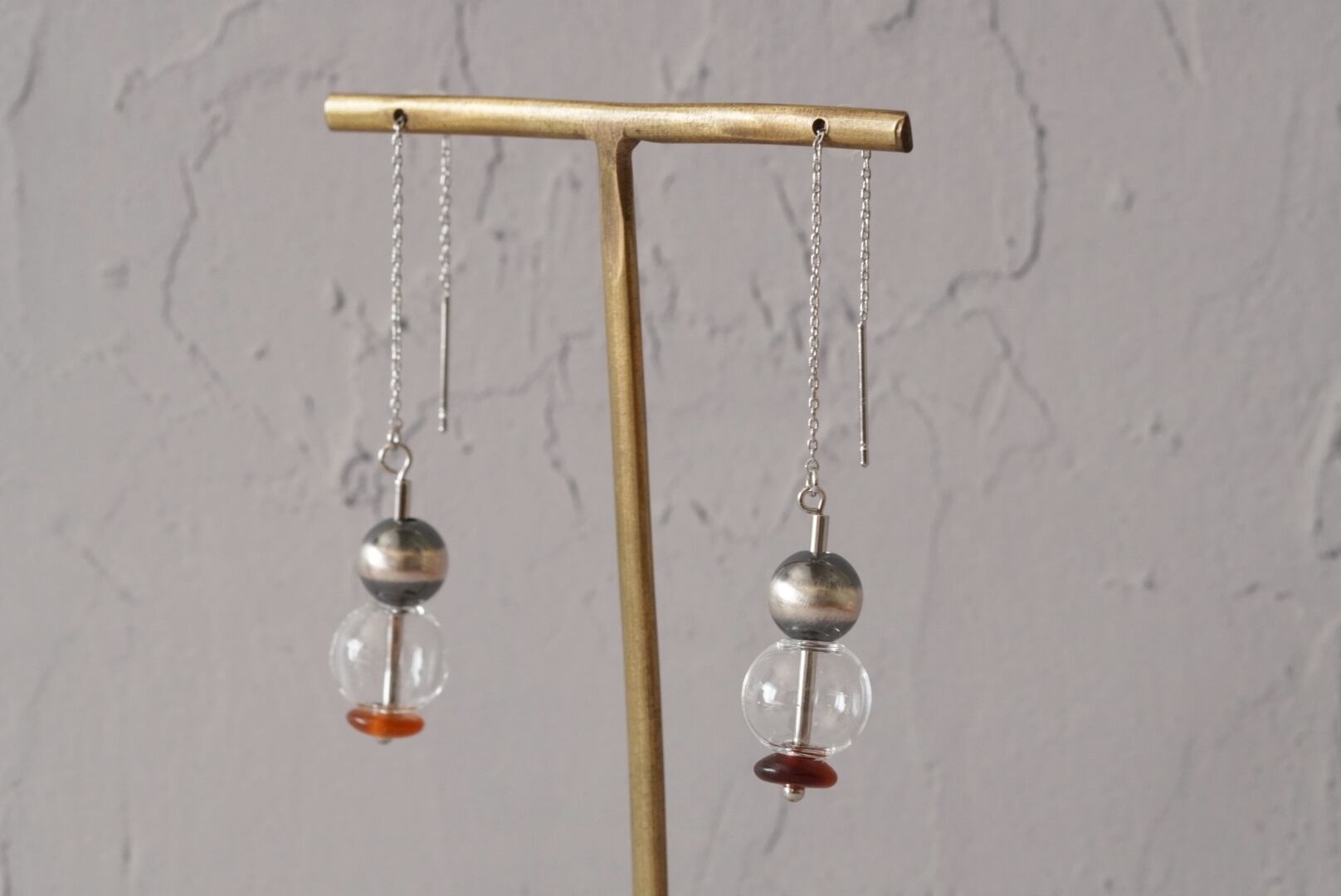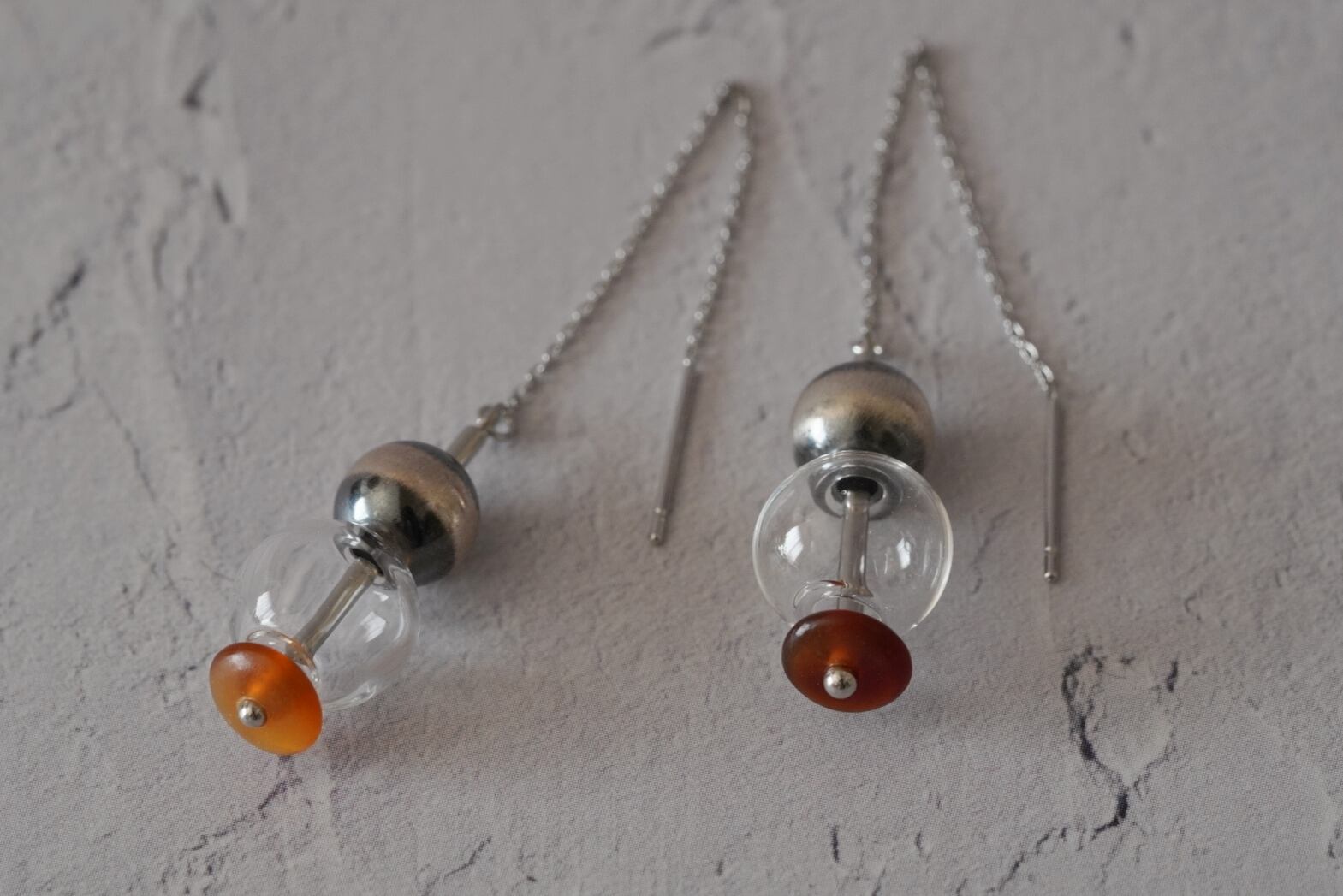 空気を含んだようなガラス、ぬくもりある飴色の水牛角と組み合わせオブジェのような雰囲気のピアスにしました。