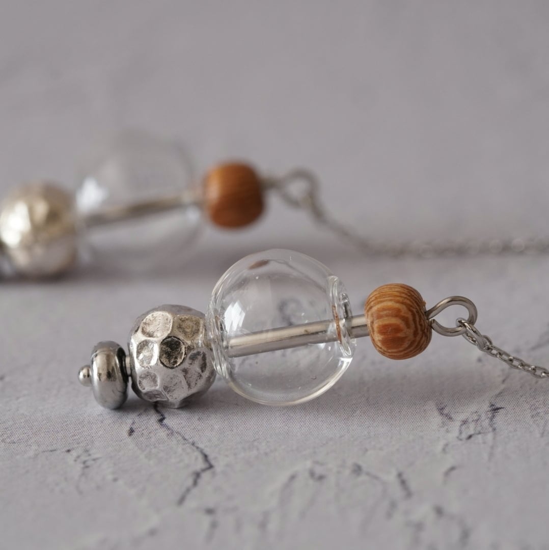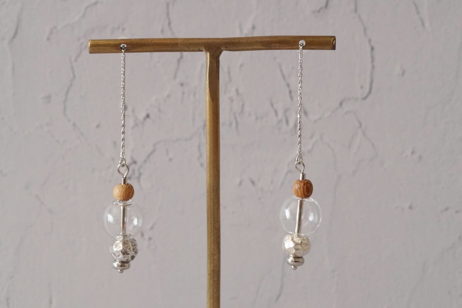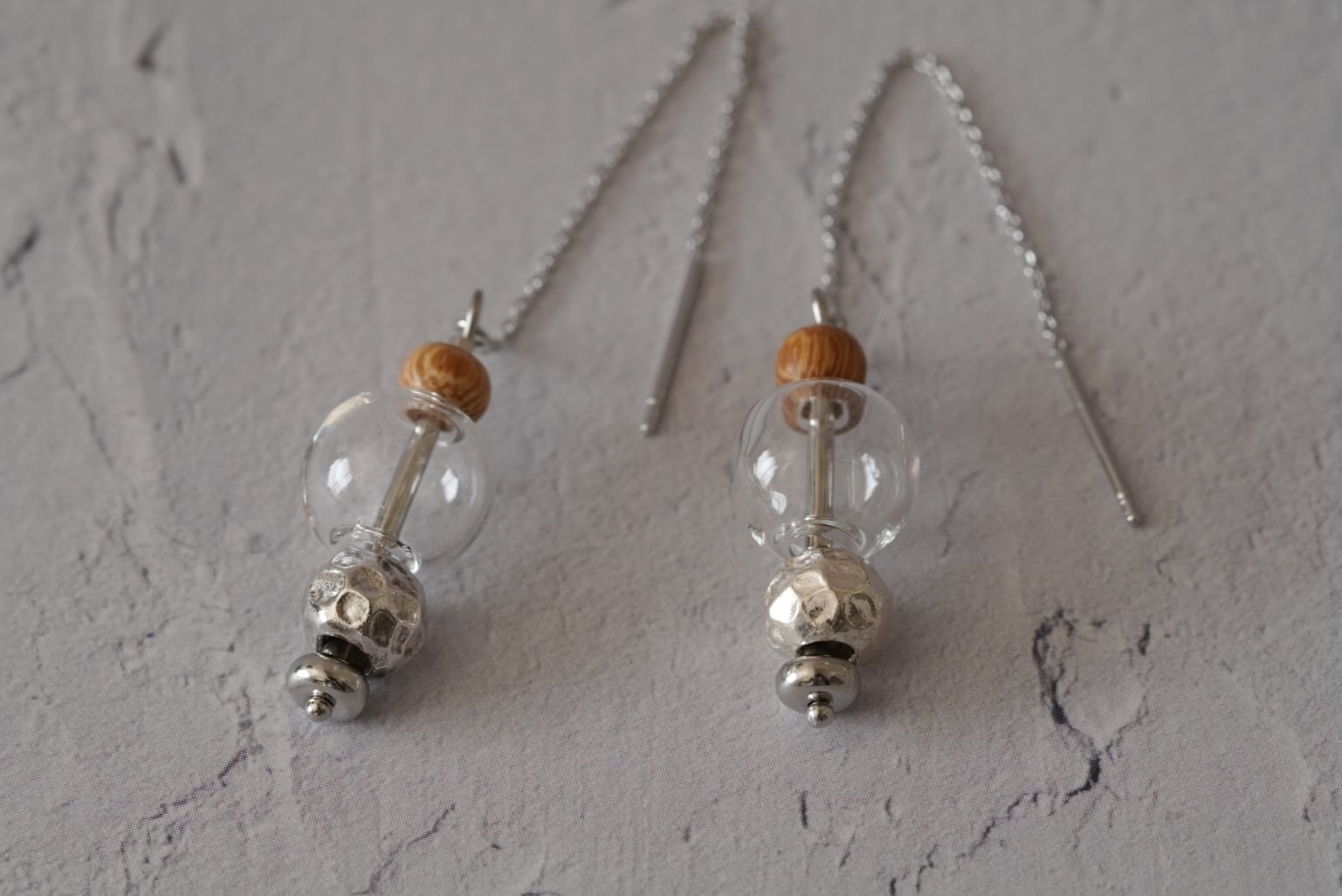 空気を含んだようなガラス、くっきりと木目の模様が出た木球と組み合わせオブジェのような雰囲気のピアスにしました。