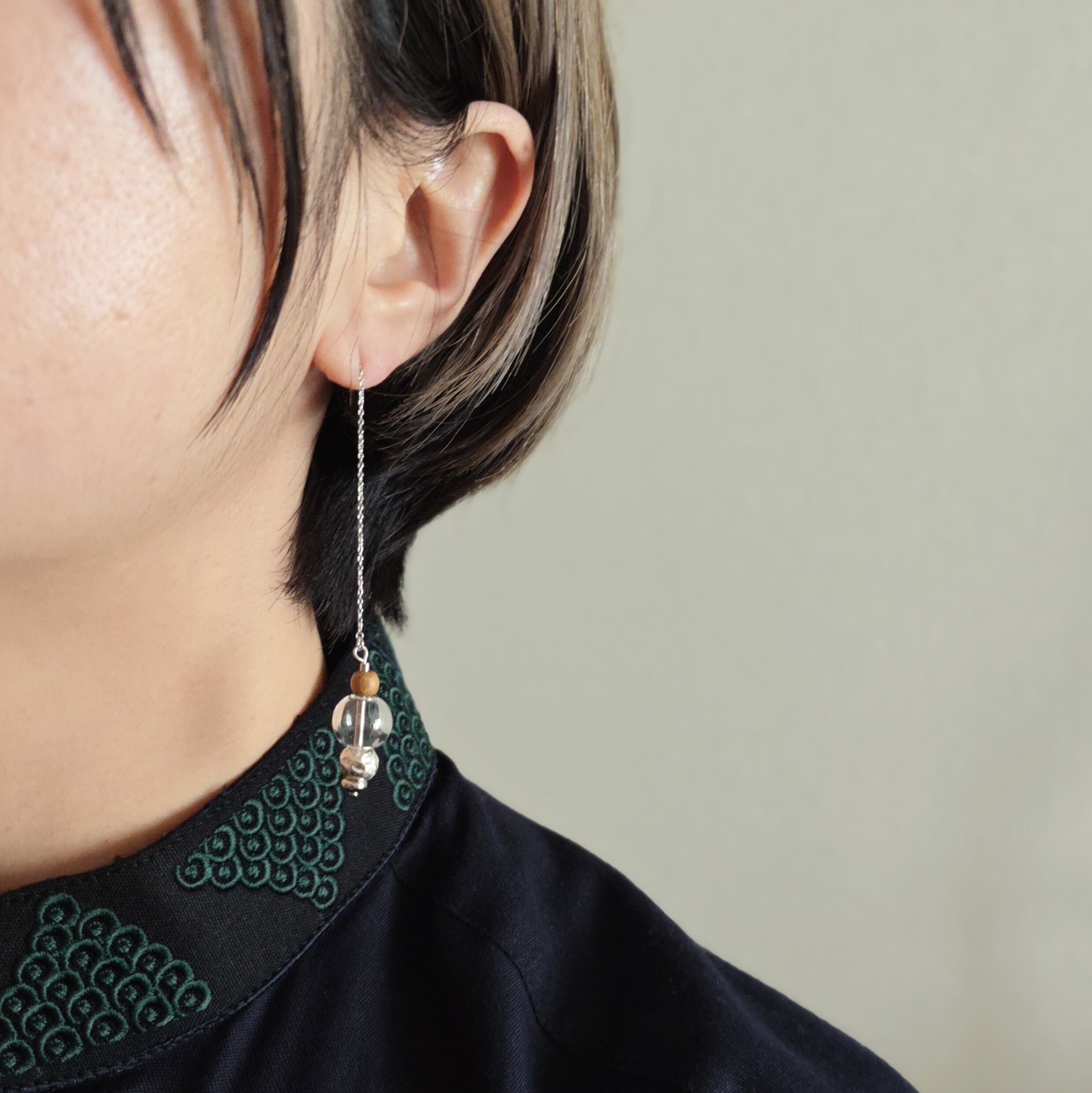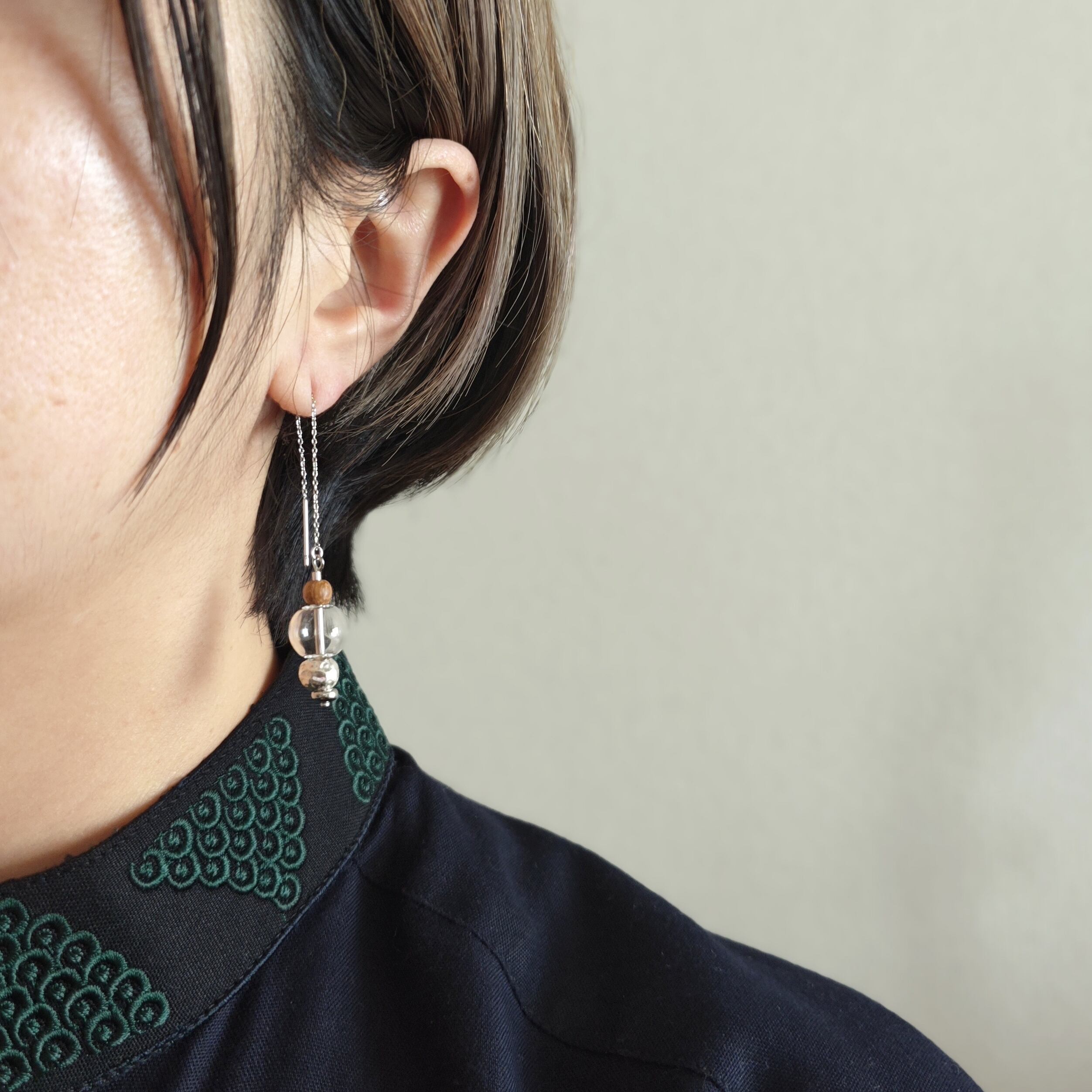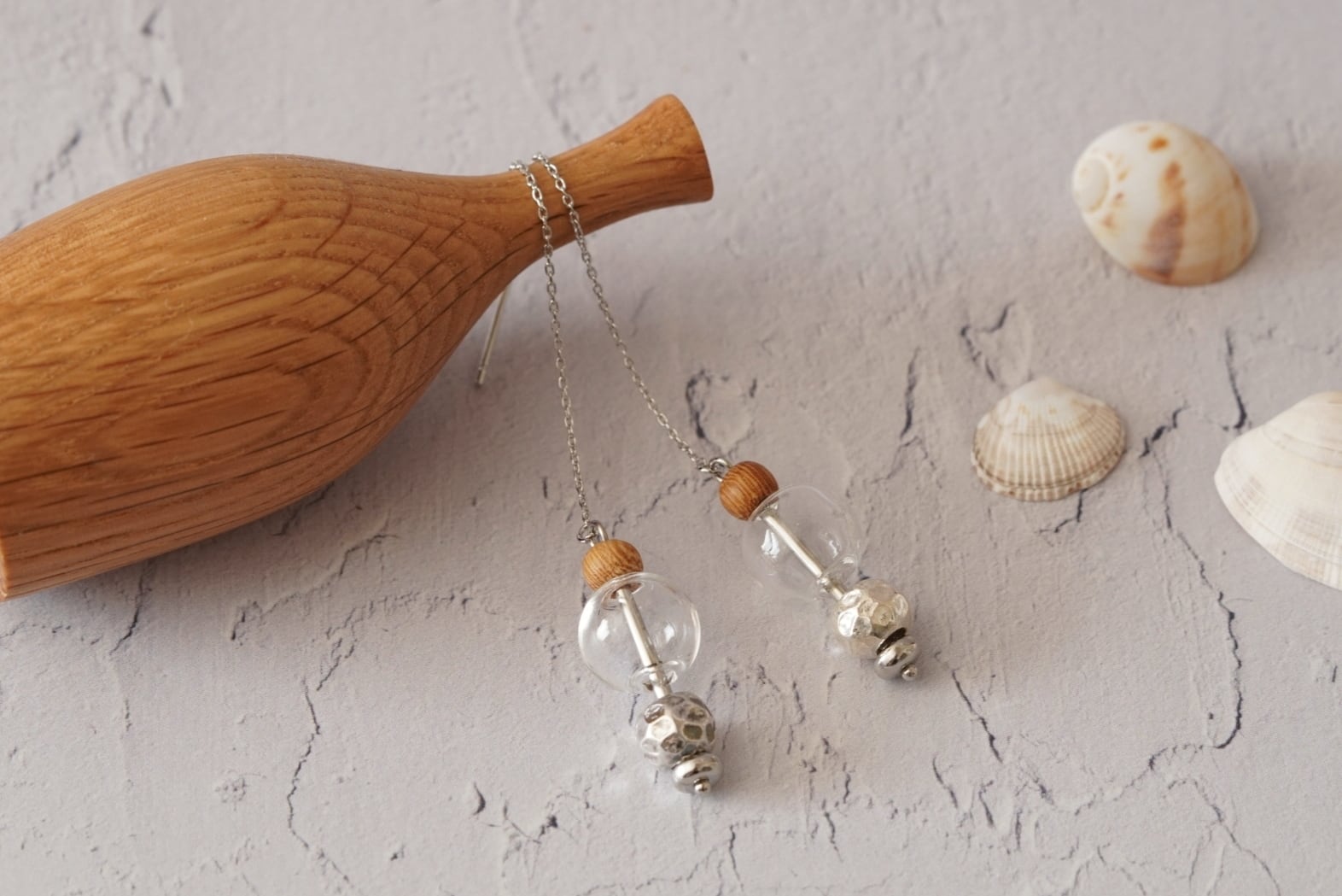 空気を含んだようなガラス、くっきりと木目の模様が出た木球と組み合わせオブジェのような雰囲気のピアスにしました。