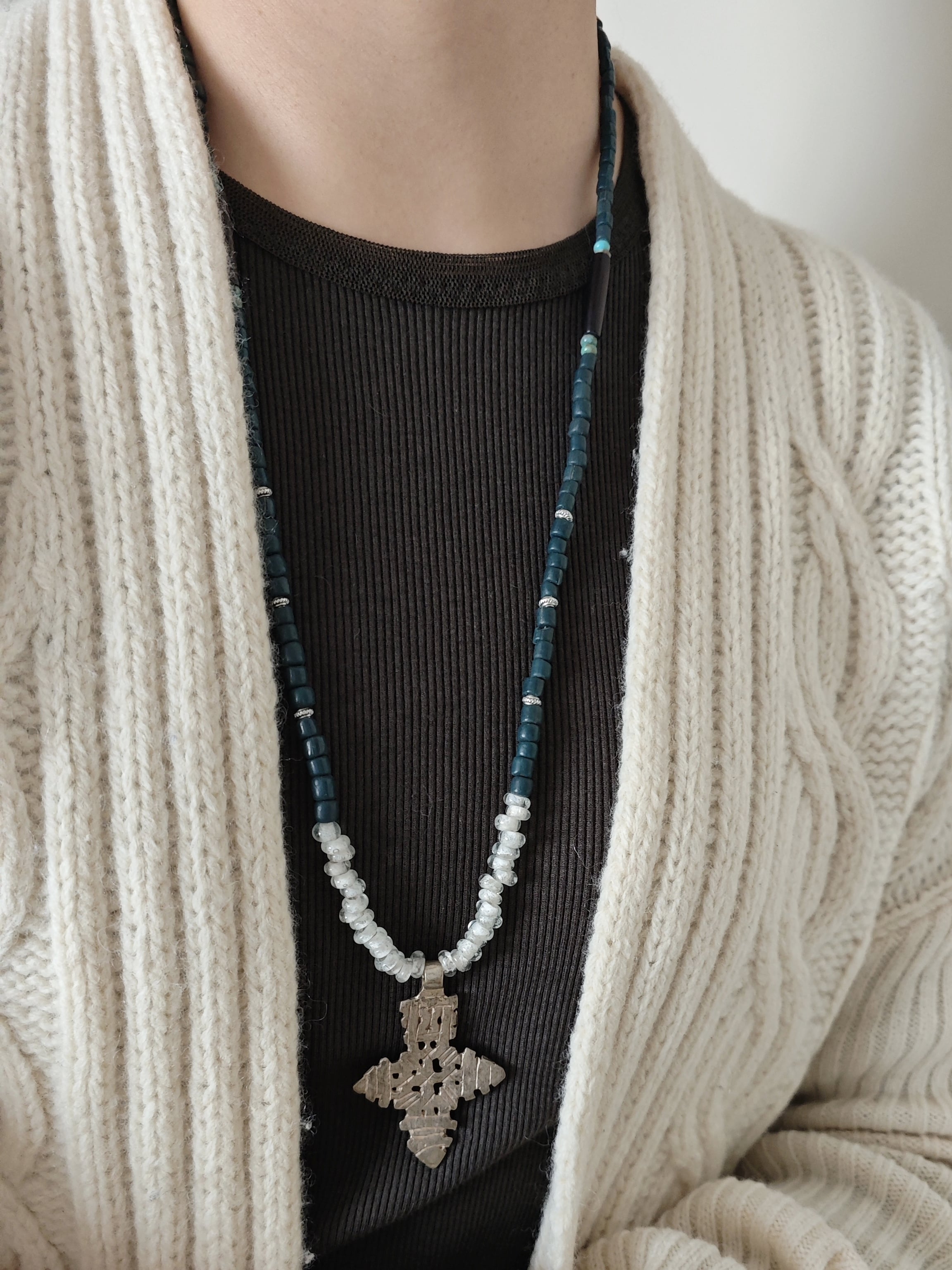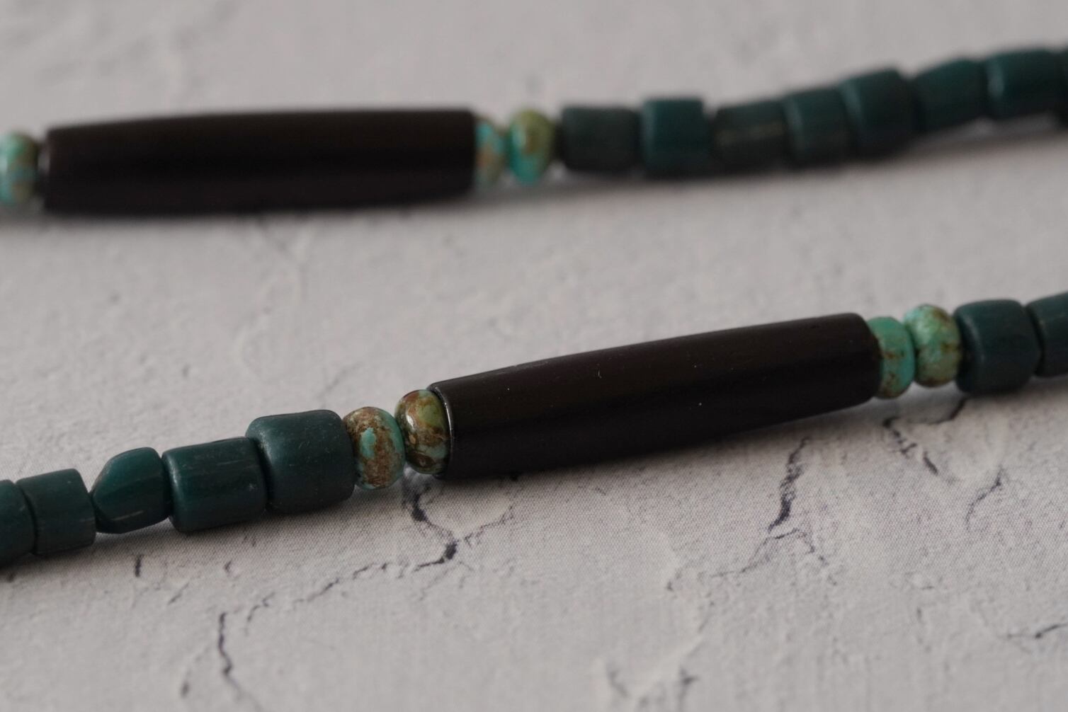 両側に加えたのはしっとりとした駱駝の骨とトルコ石のビーズ。