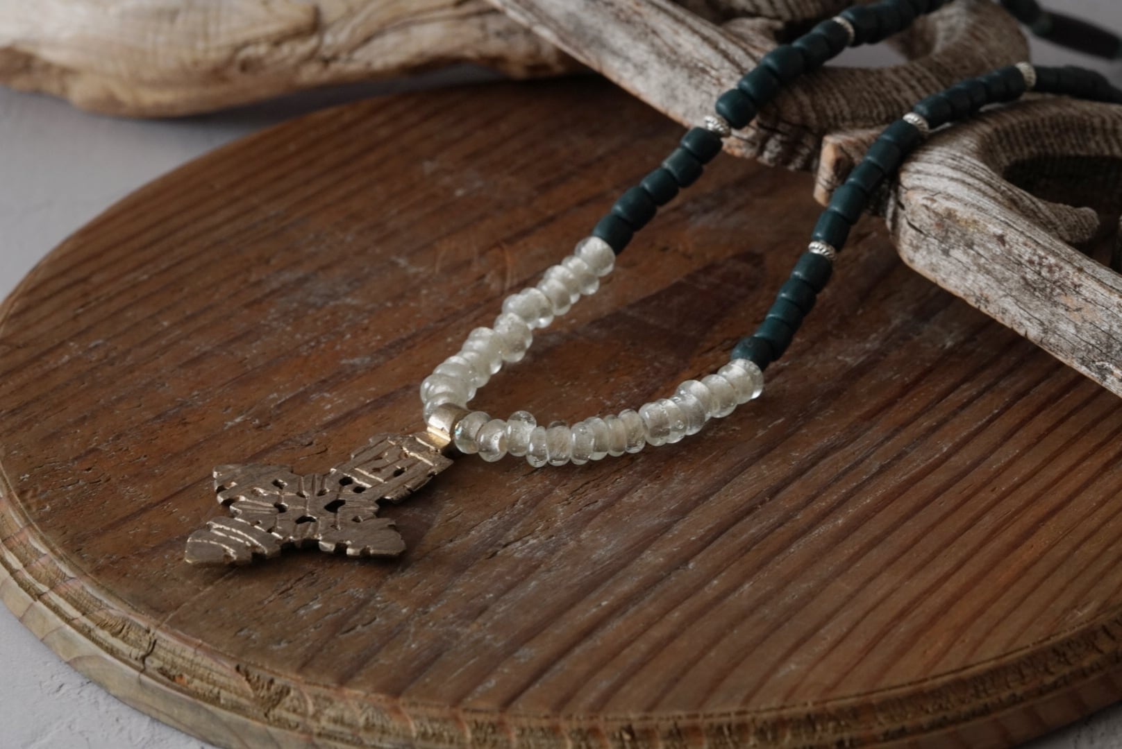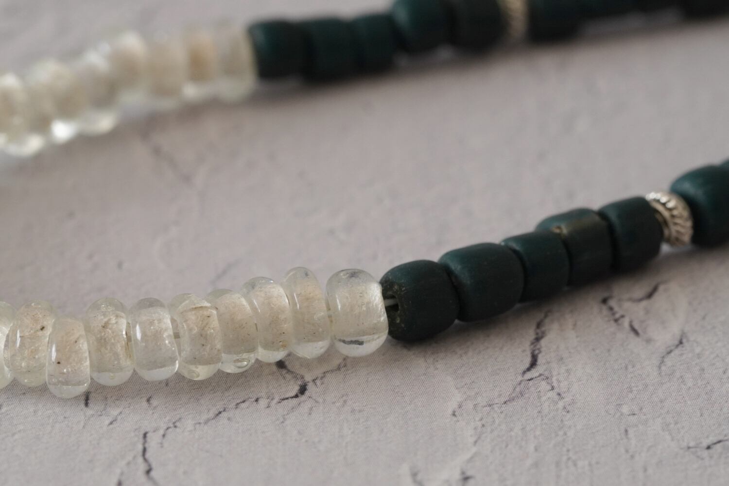 空気を含んだような、透明でいびつなガラスビーズはインドネシアのもの。