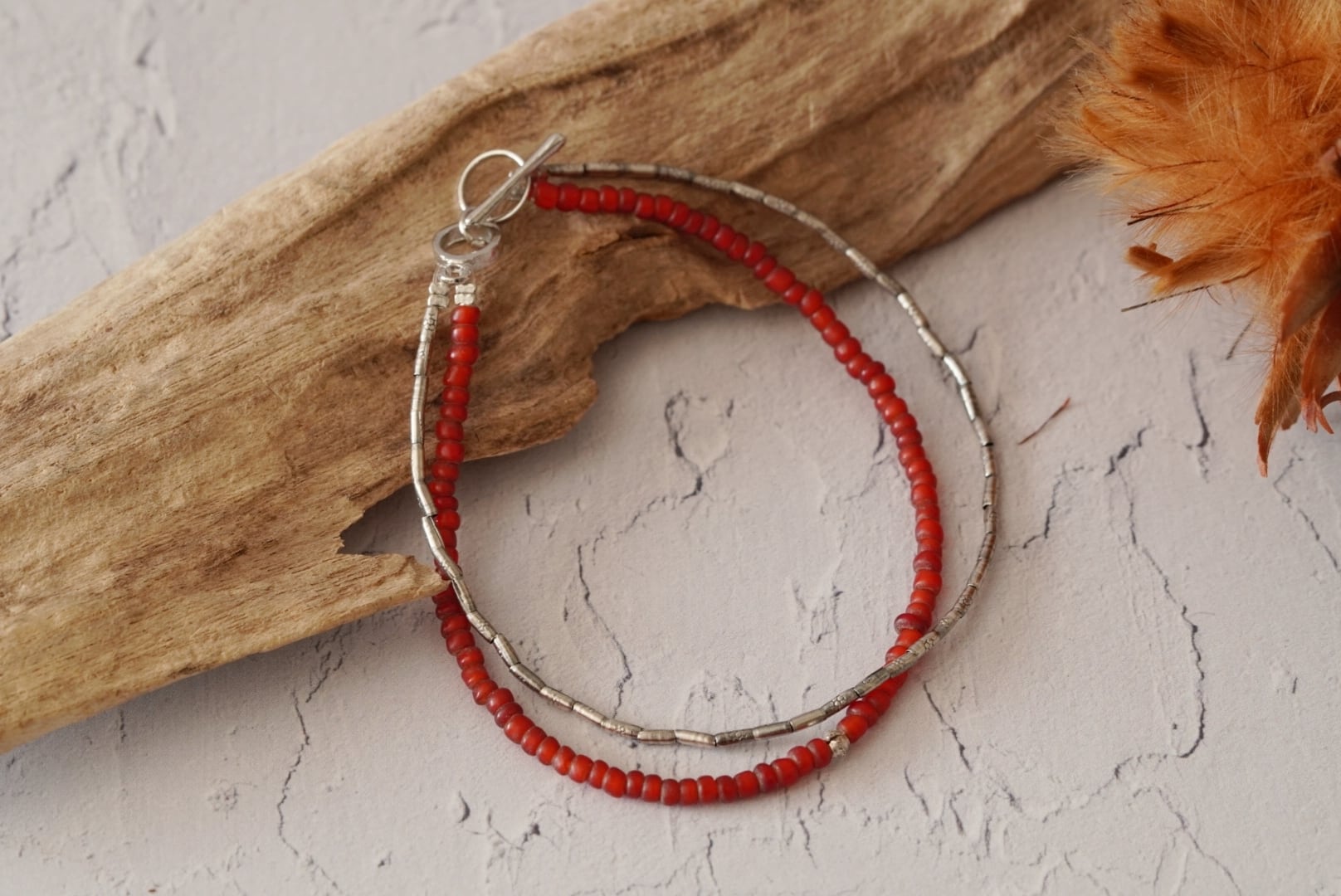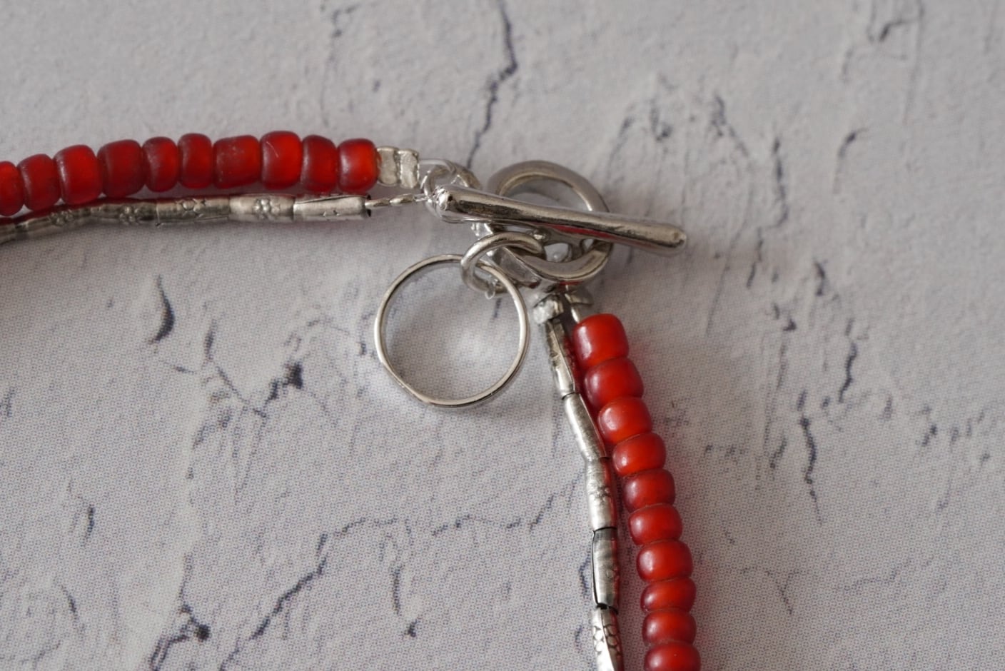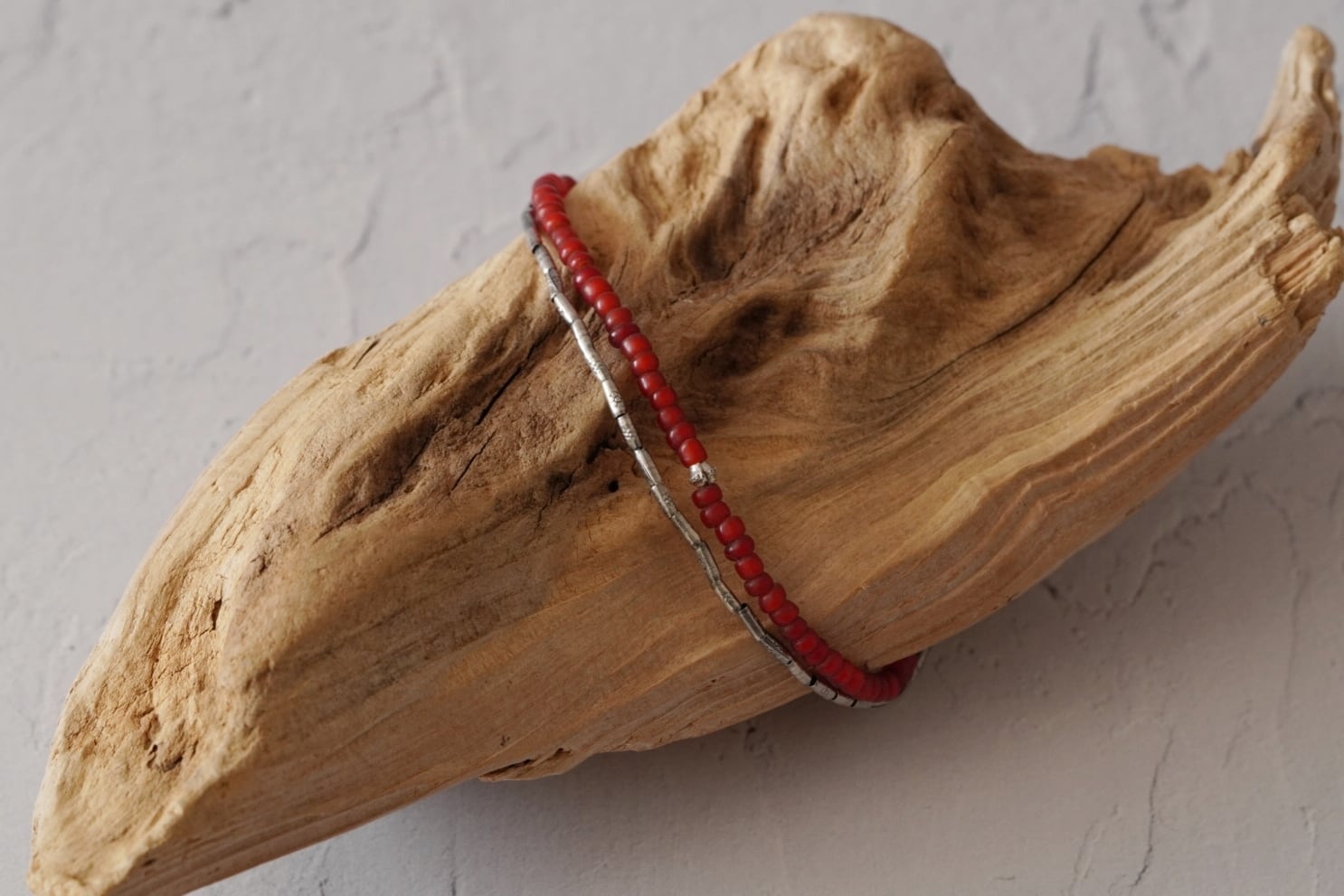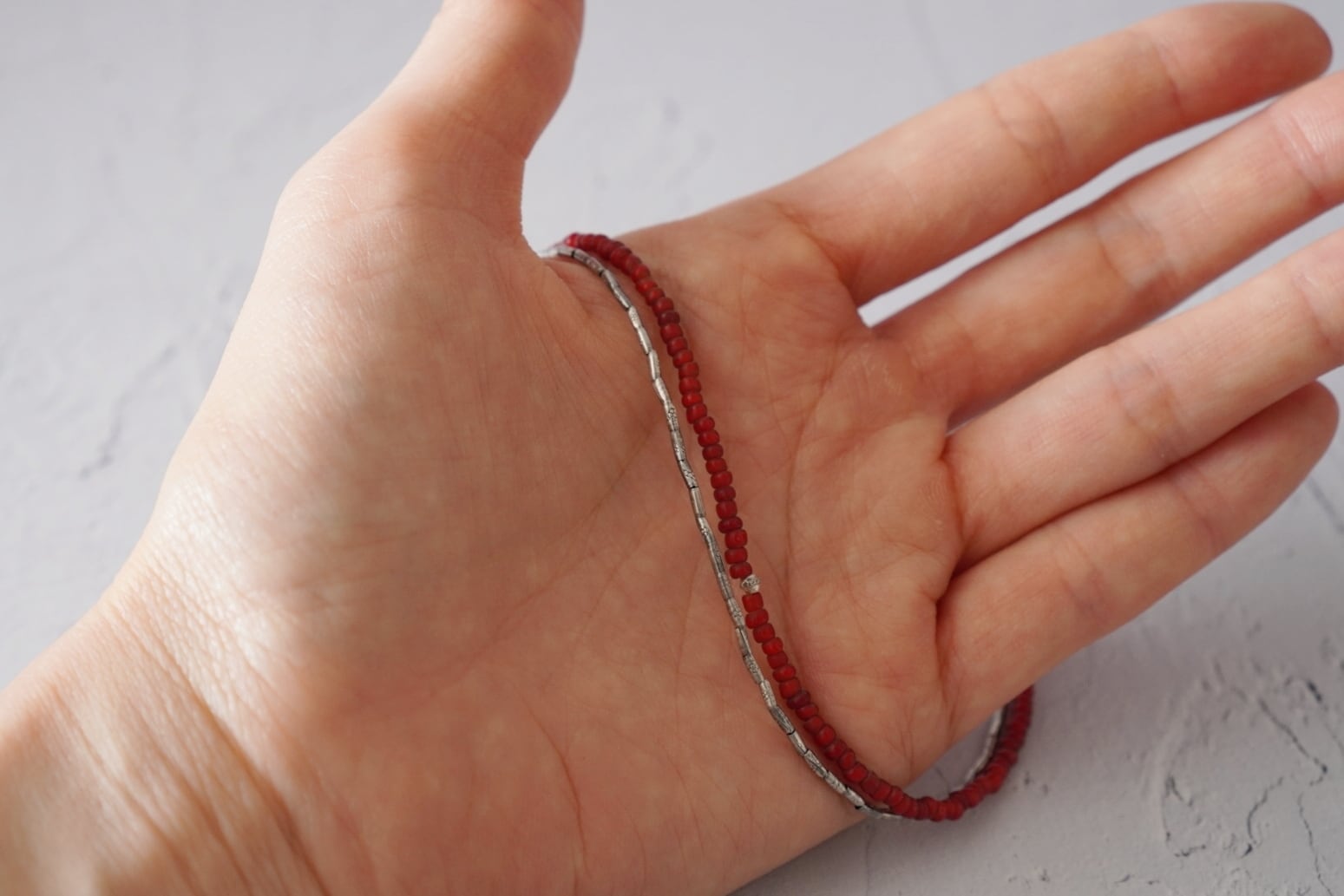 この二重構造により発色が鮮やかになることが特徴ですが、こちらのビーズは柘榴の実のような落ち着いたトーンの赤色がとても上品です。