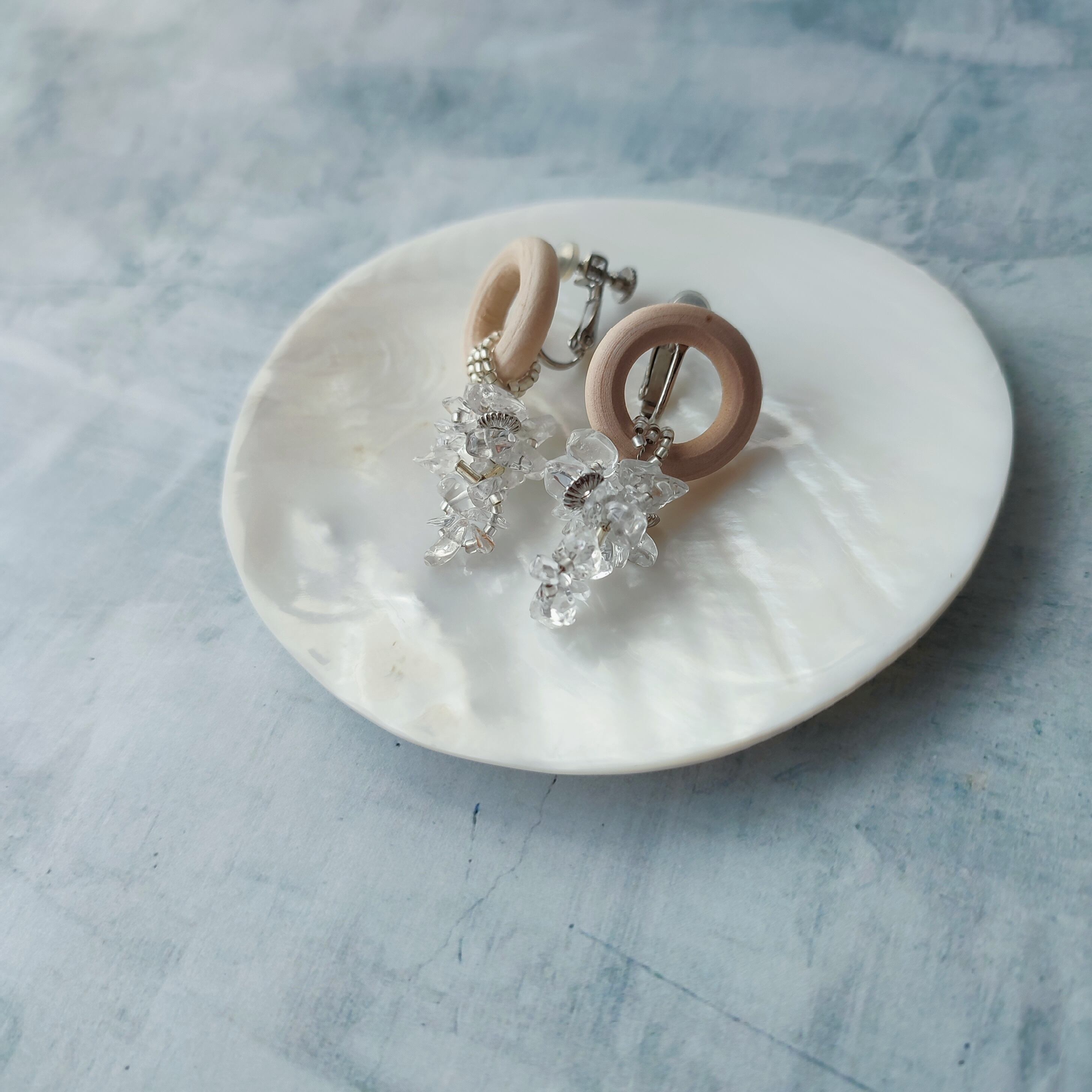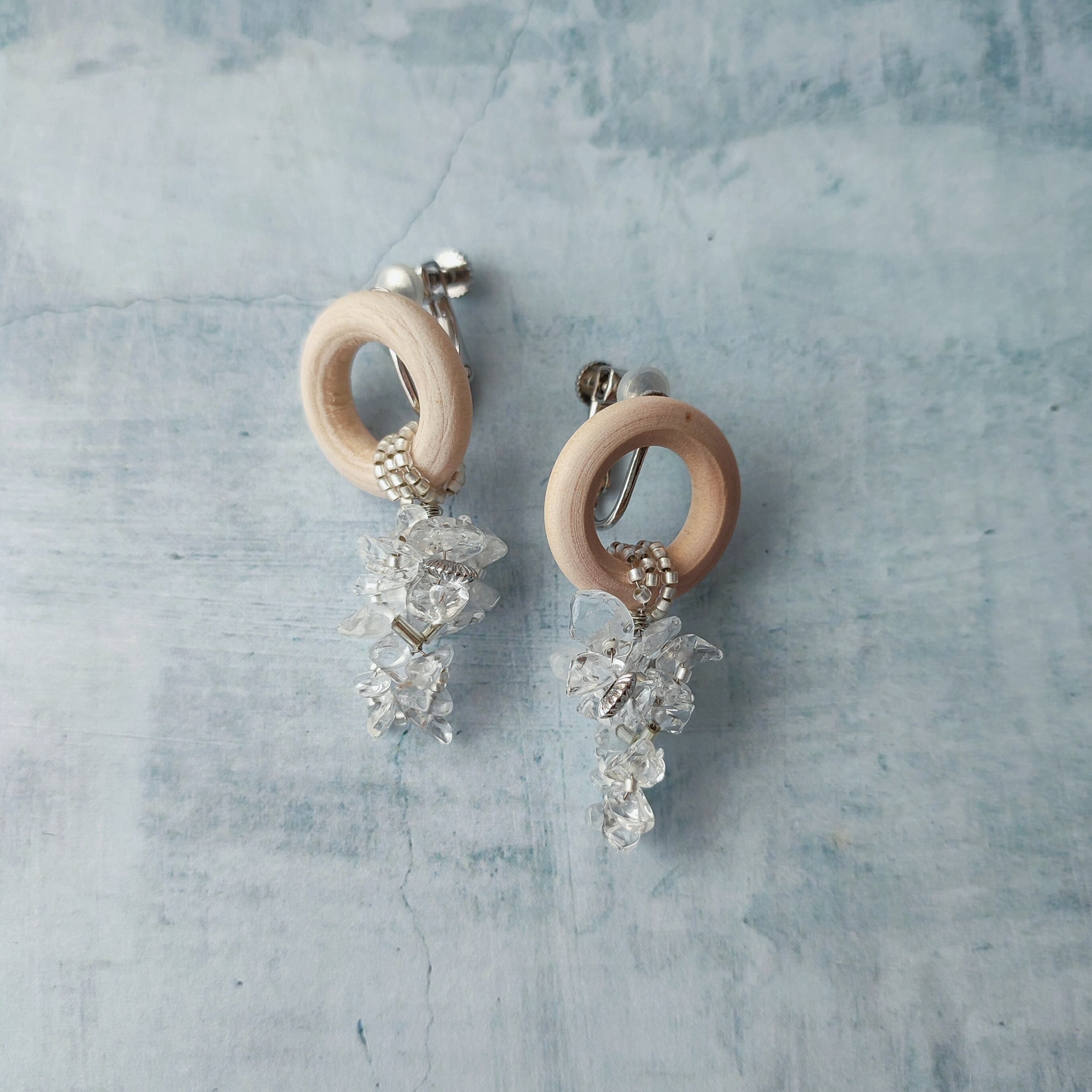 氷のように透明な水晶の粒を葡萄の房状に仕立てたイヤリングです。