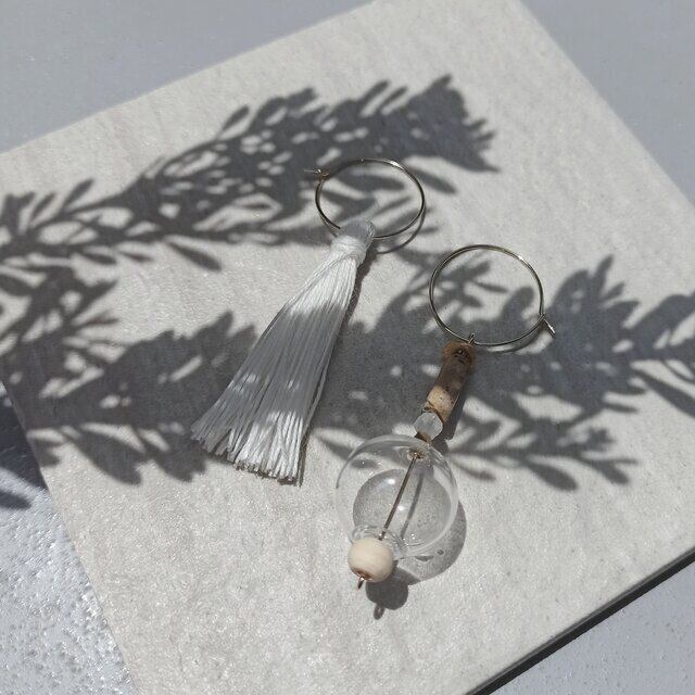 透明なガラス玉とタッセルのアシンメトリーイヤリング