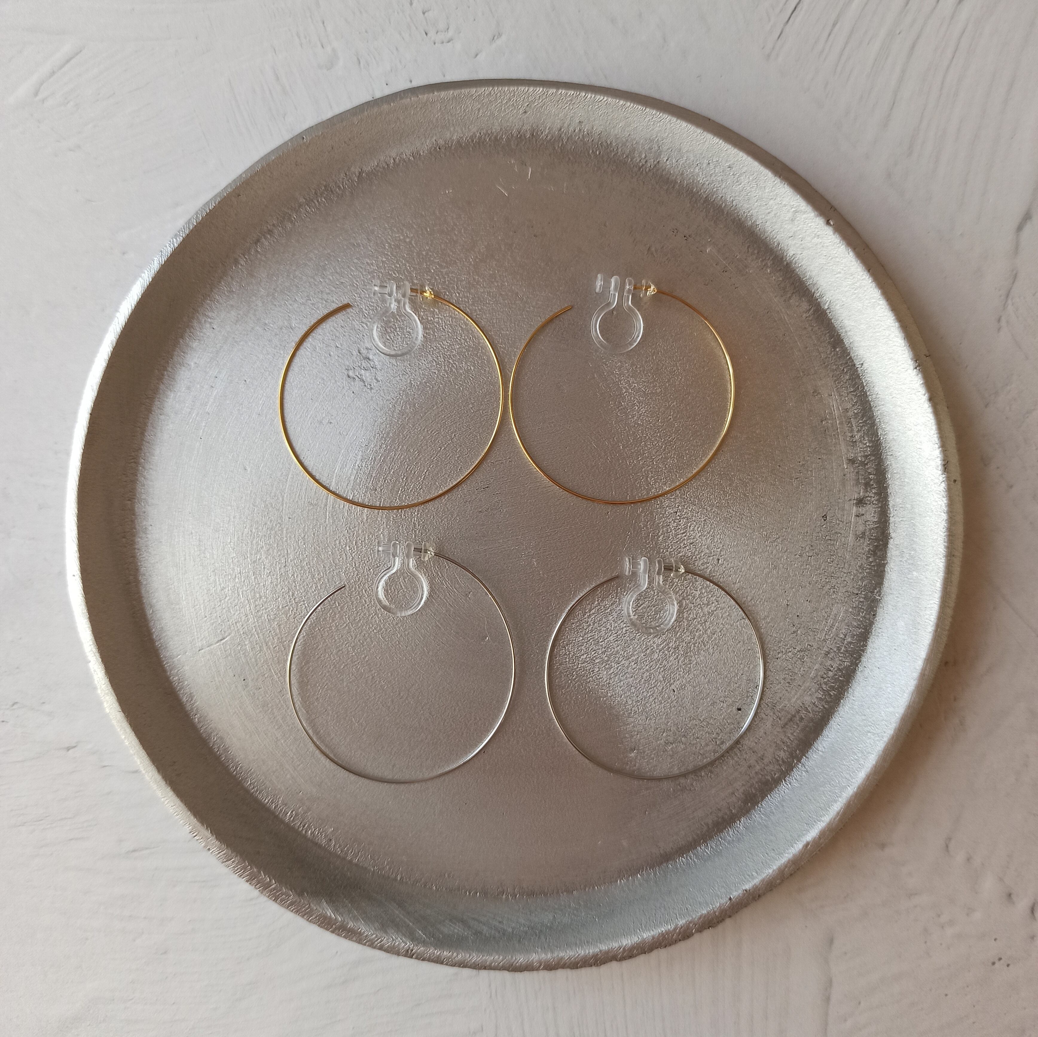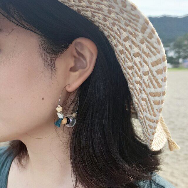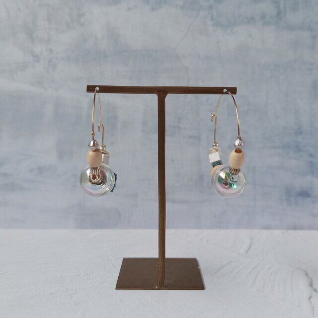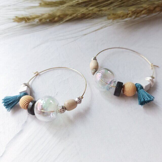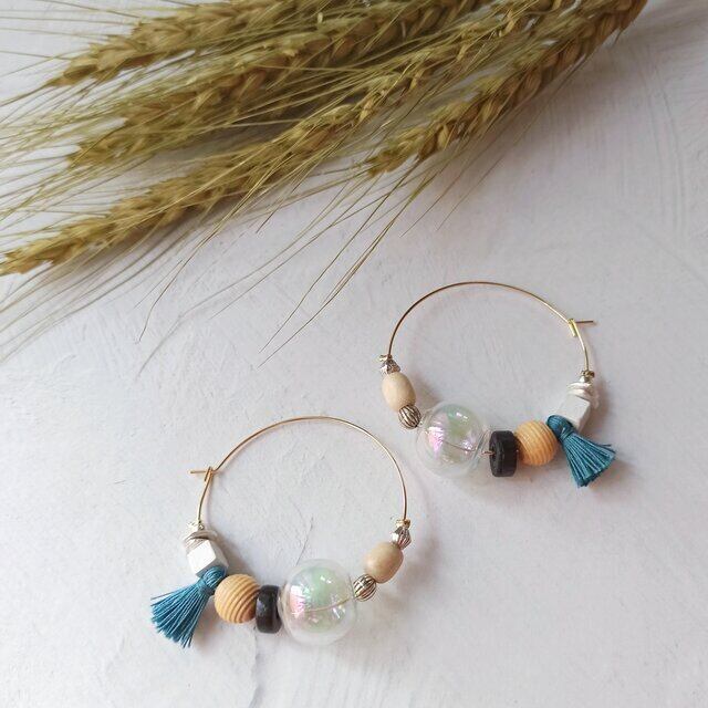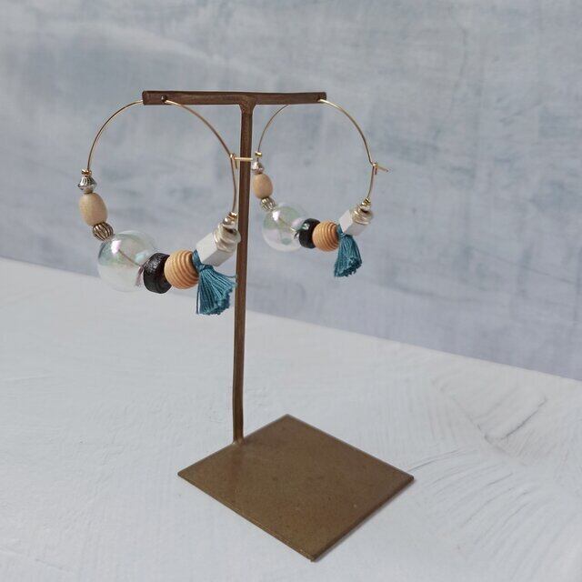 様々な色や形のウッドを積み木のように組み合わせた大ぶりのフープタイプのイヤリングです。