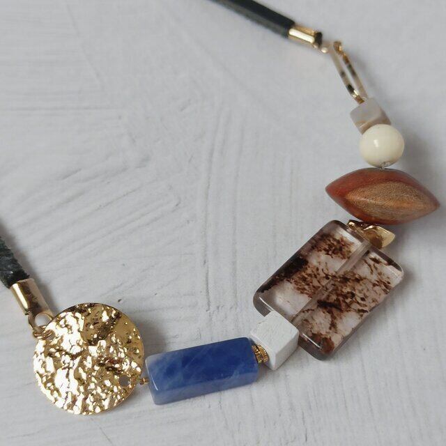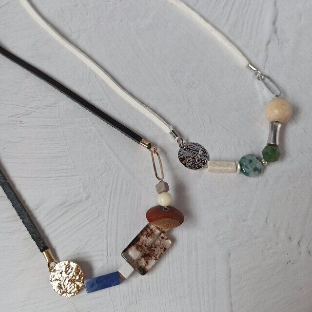 天然石やウッドビーズ、インポートビーズ等を使用しシンプルなコーディネートのポイントとなるようにしました。