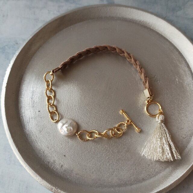 チェーンやエコスエードレザー、タッセルを組み合わせたブレスレットです。