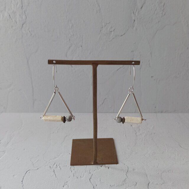 アイボリー系の天然石を組み合わせてシャープな三角形を象ったピアスです。
