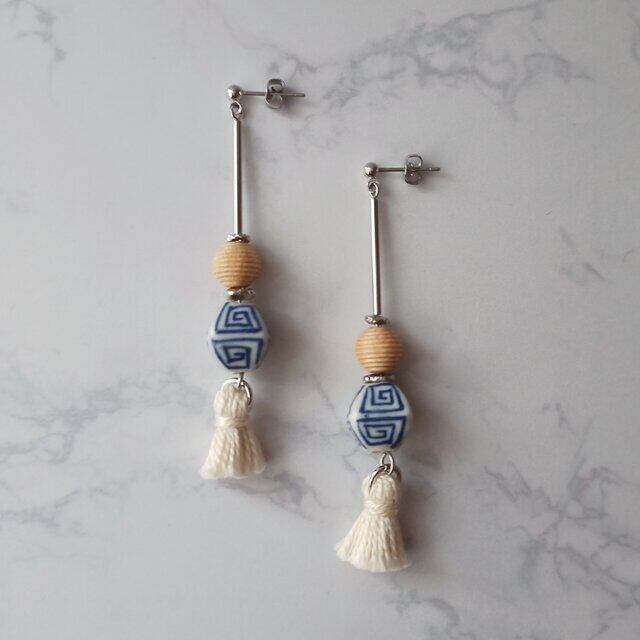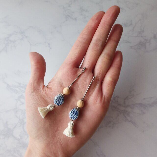 白地に青で渦巻模様の描かれた陶器のビーズをポイントにした