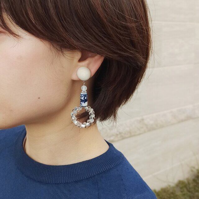 白地に青色で植物の描かれた陶器のビーズをポイントにした、