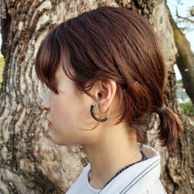 小さなメタルのカフを耳の上部につける重ね付けコーディネートも素敵です。