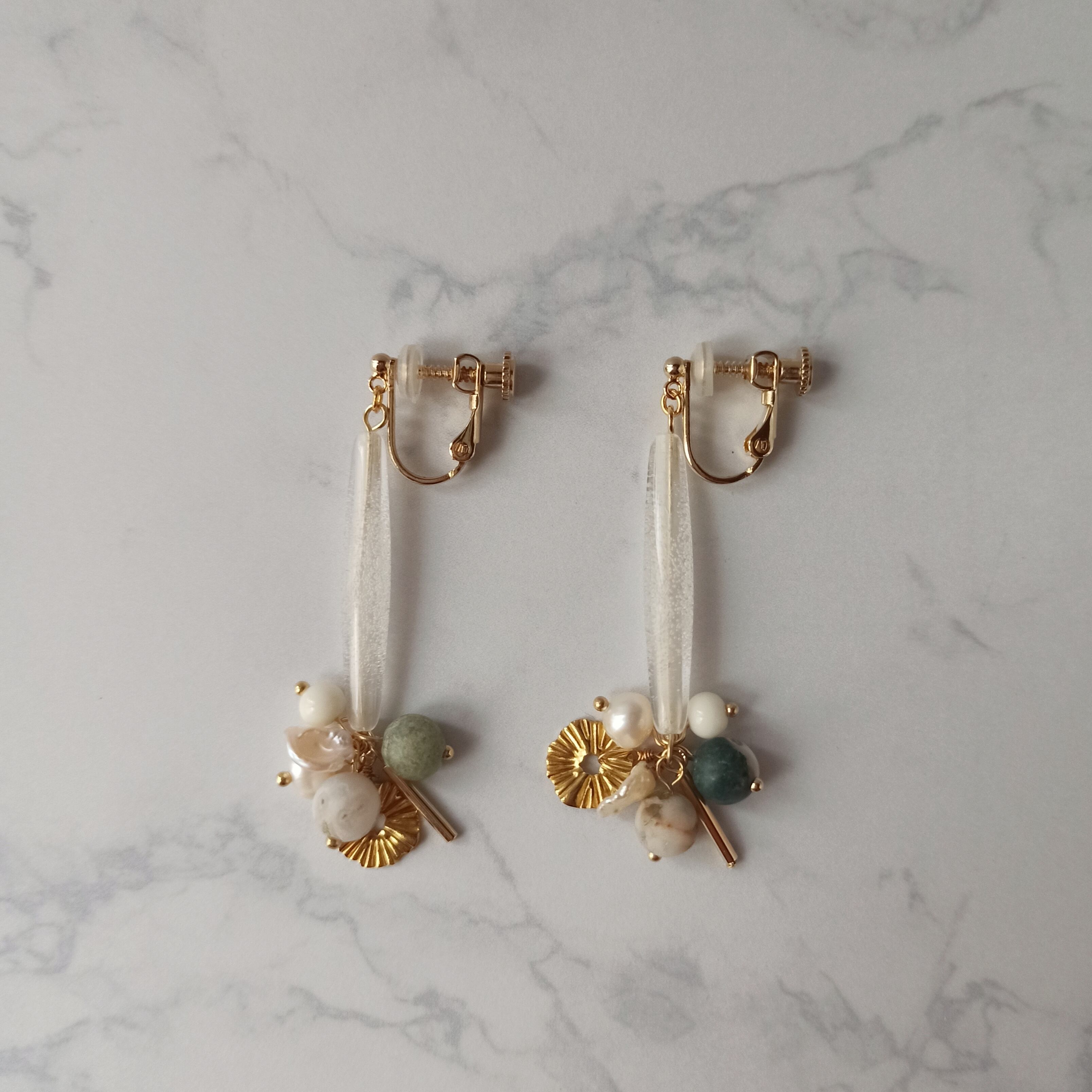 淡水パールや天然石を火花のよう散らした縦長ラインのイヤリングです。