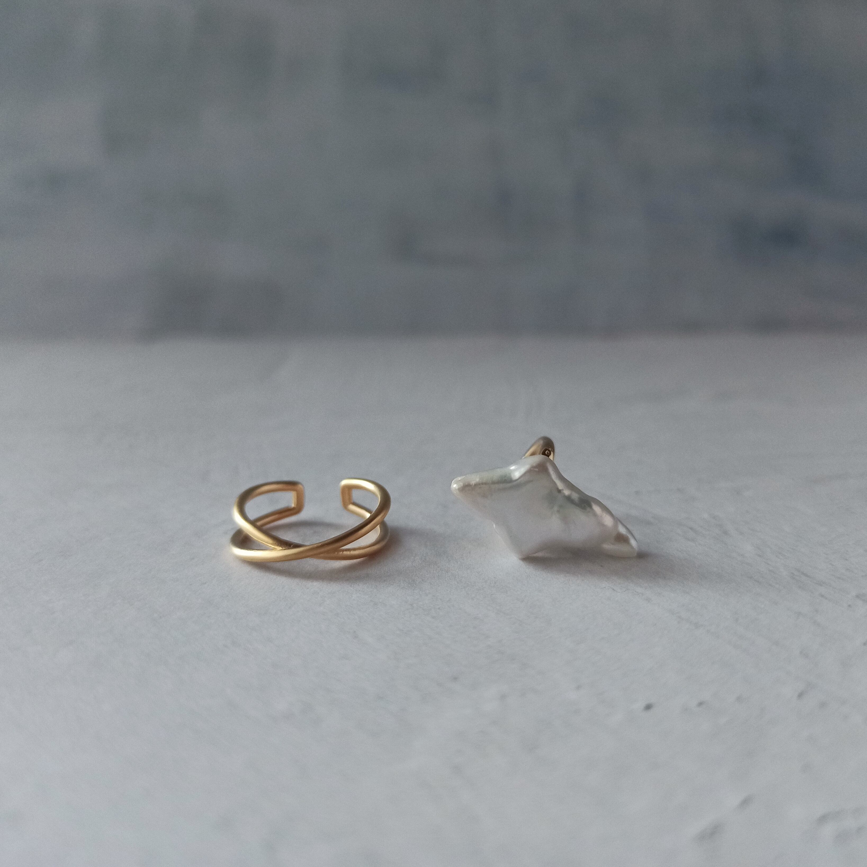 肌馴染みがよく使い勝手のよいクロスラインのイヤーカフは淡水パールのイヤーカフと組み合わせ、片耳に重ね付けをしたり、片耳ずつ両耳に着けて楽しめるのはもちろんのこと