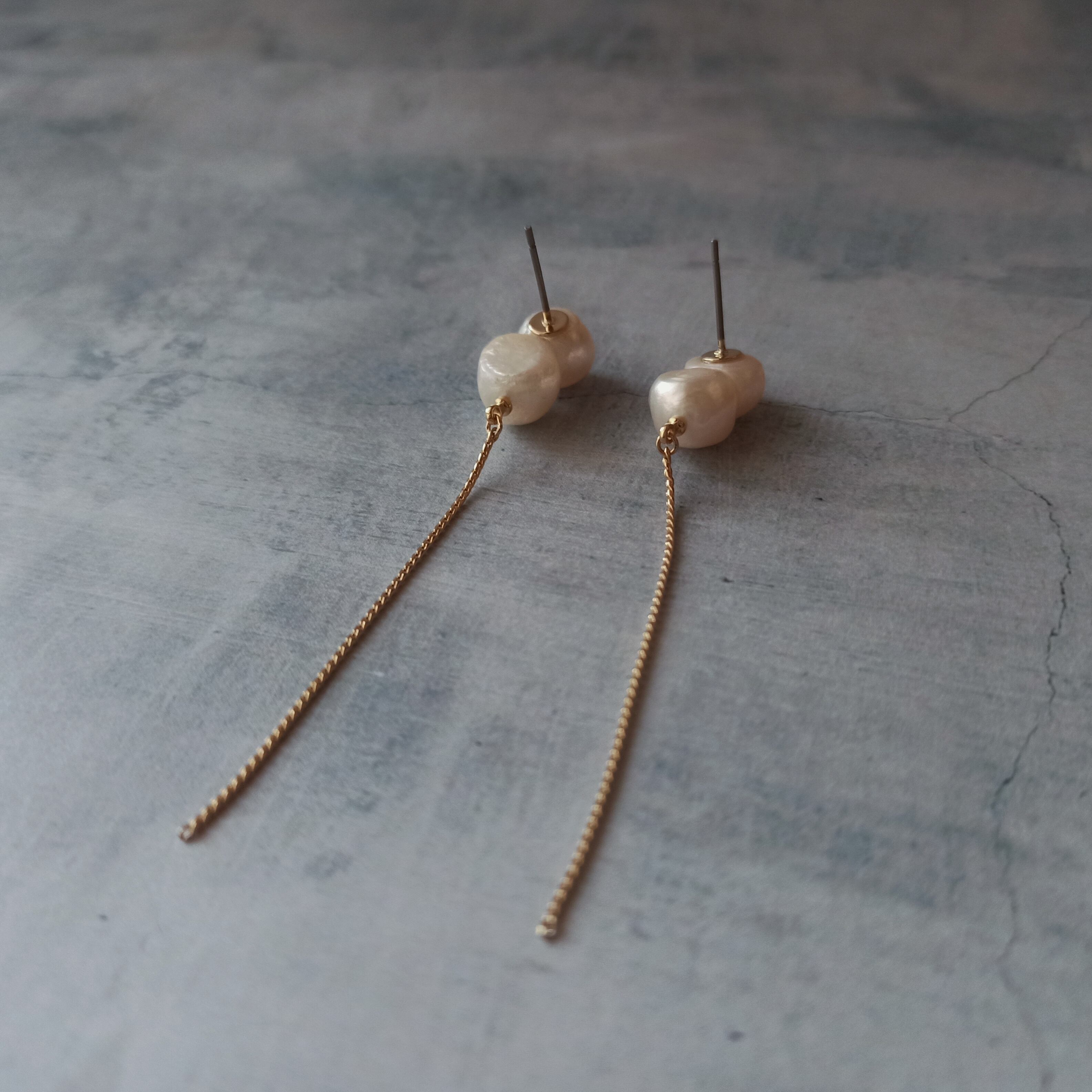 しなやかなゴールドカラーのチェーンが揺れるロングピアスに仕立てました。