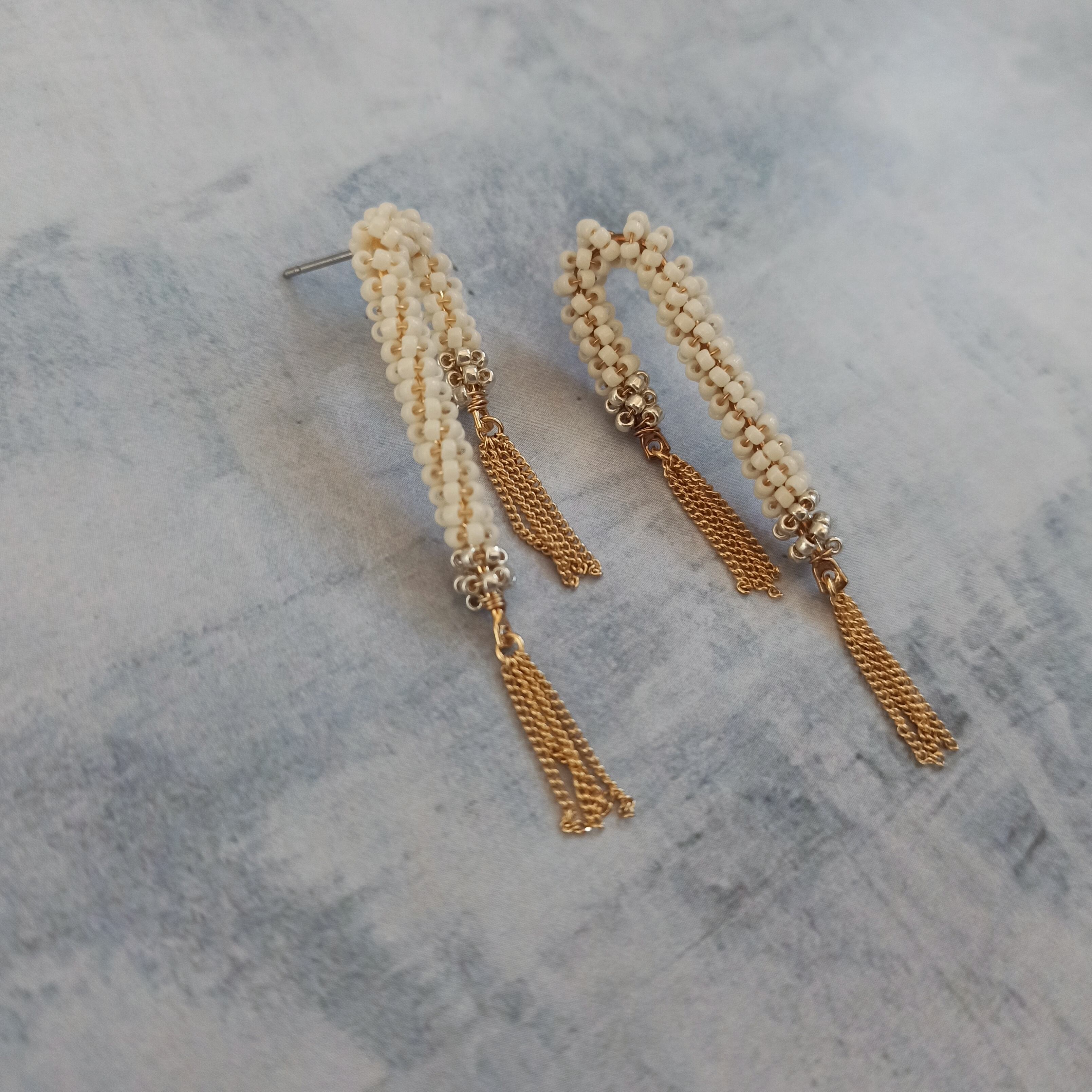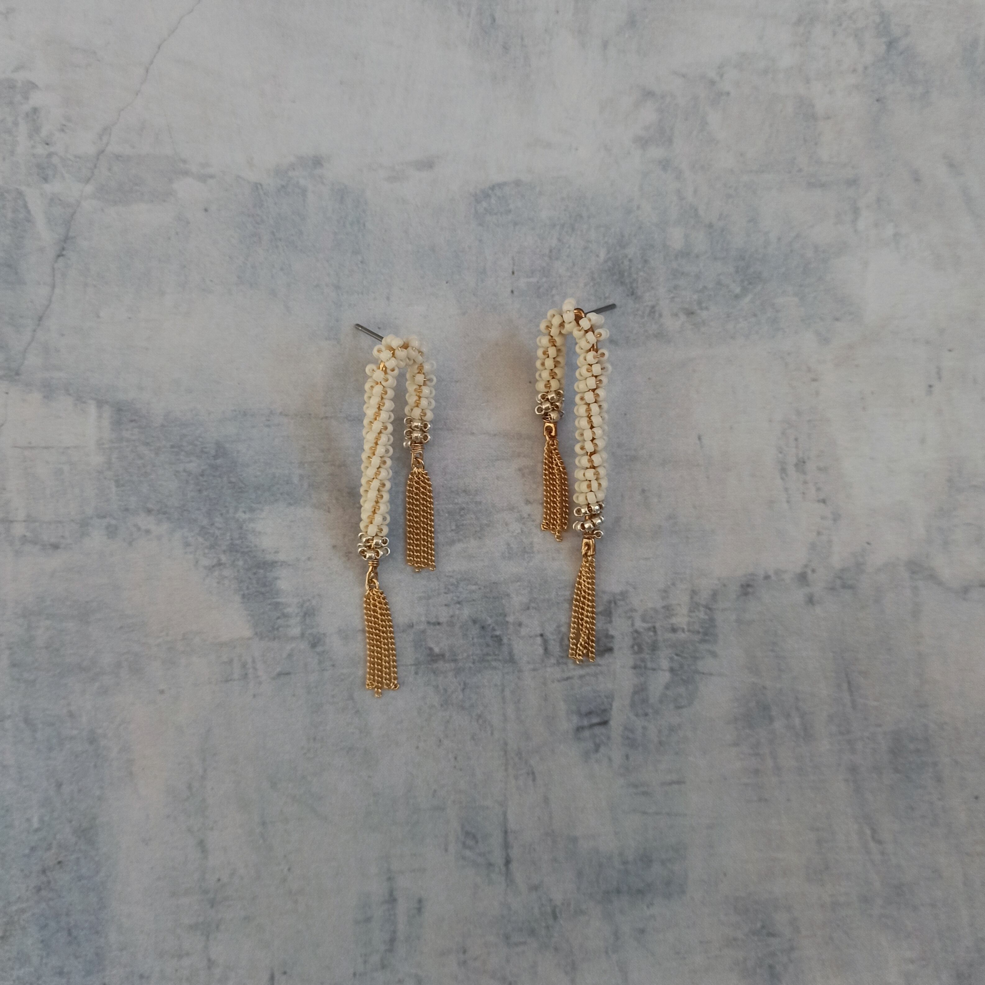 燦燦と射す陽光の束のように細かなチェーンのタッセルが揺れる耳飾りです。