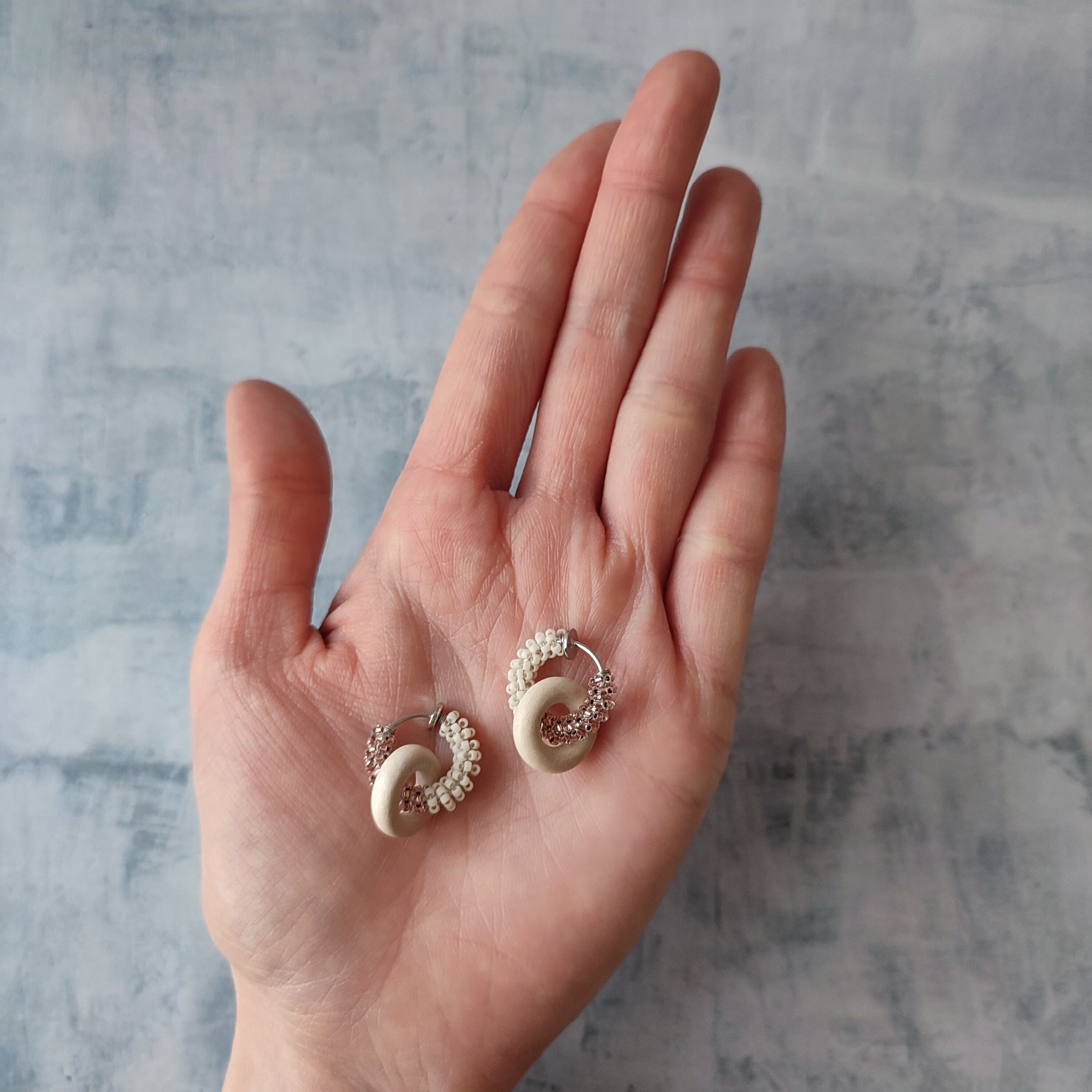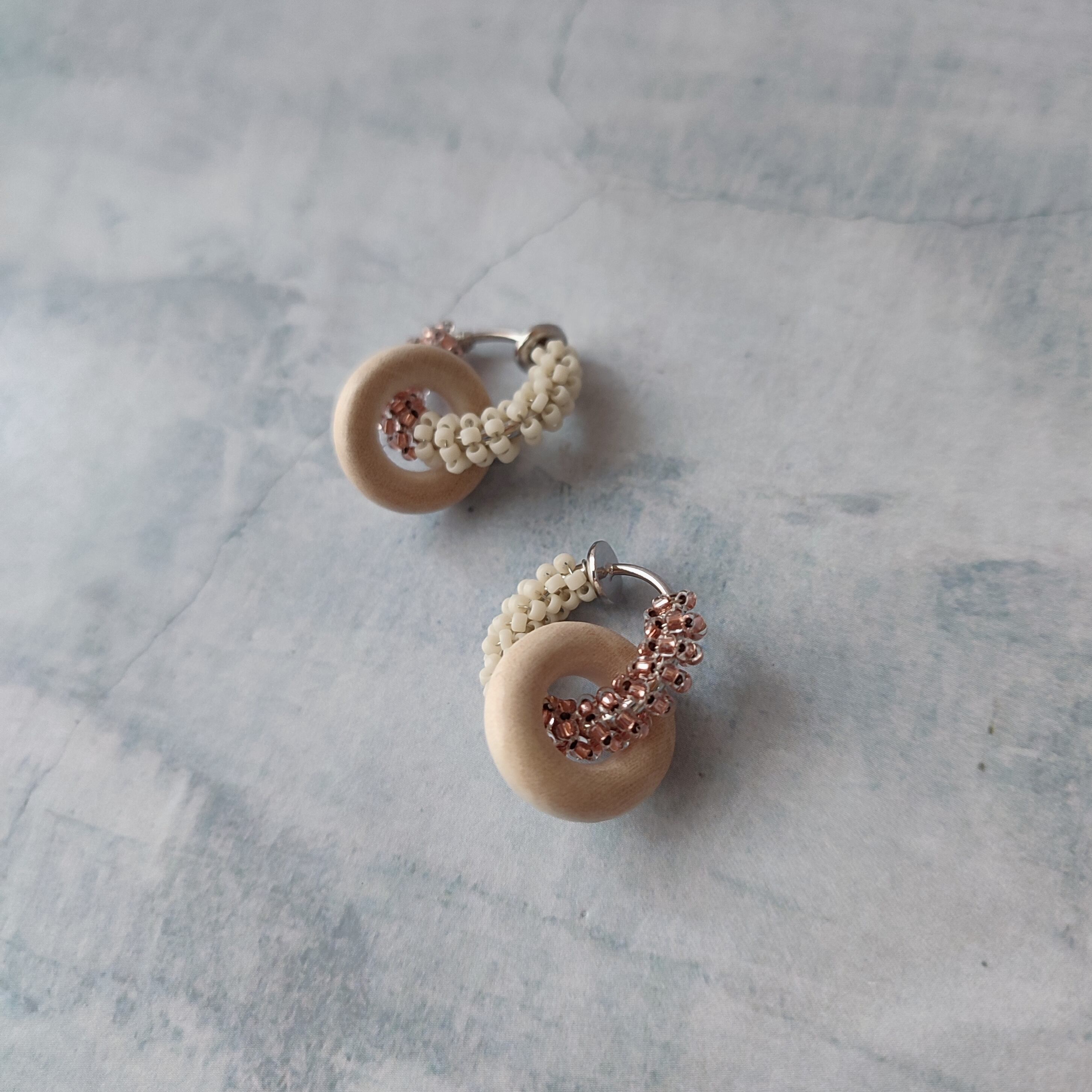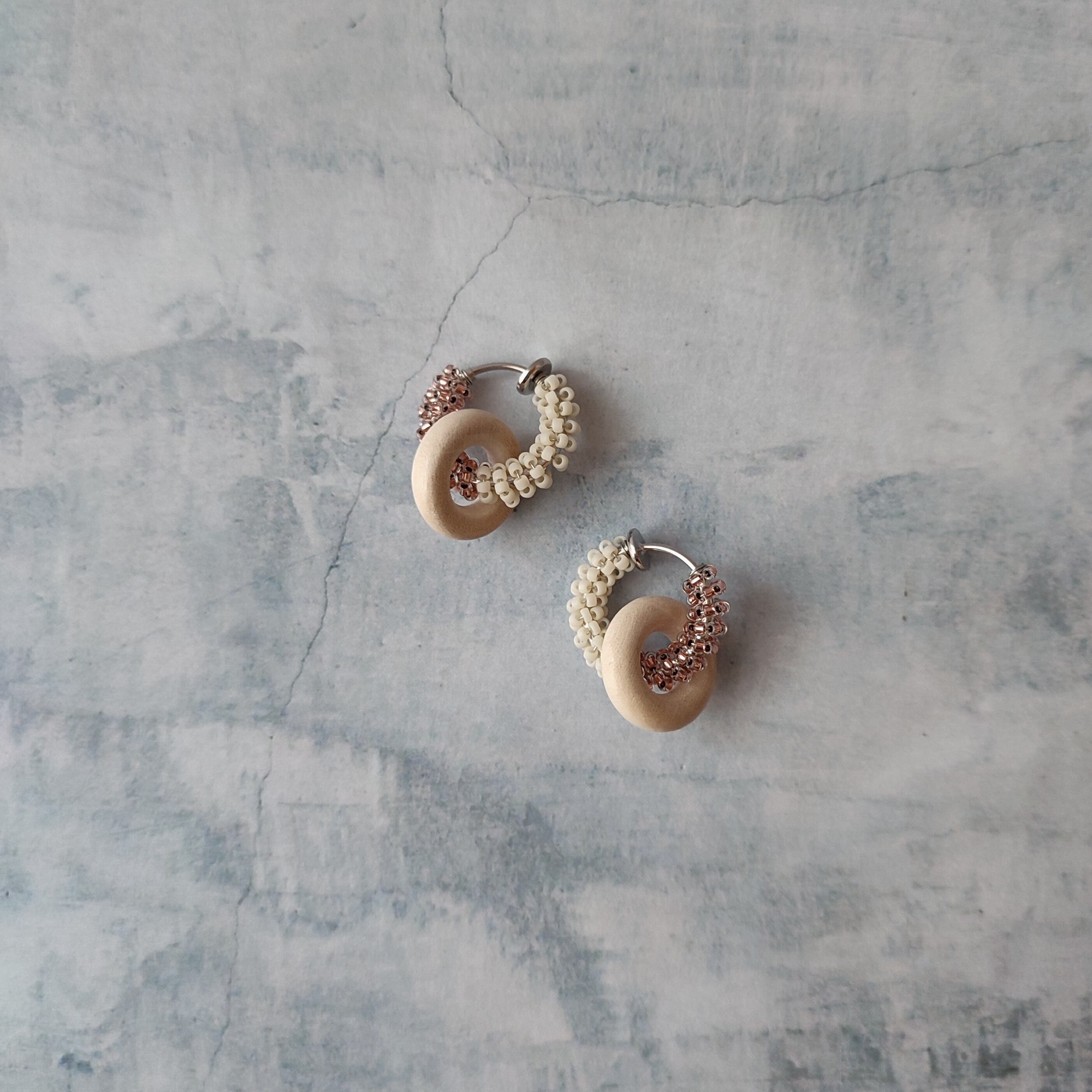 フープに通したまま着用するとガラスビーズとの素材の違いをお楽しみ頂けますが