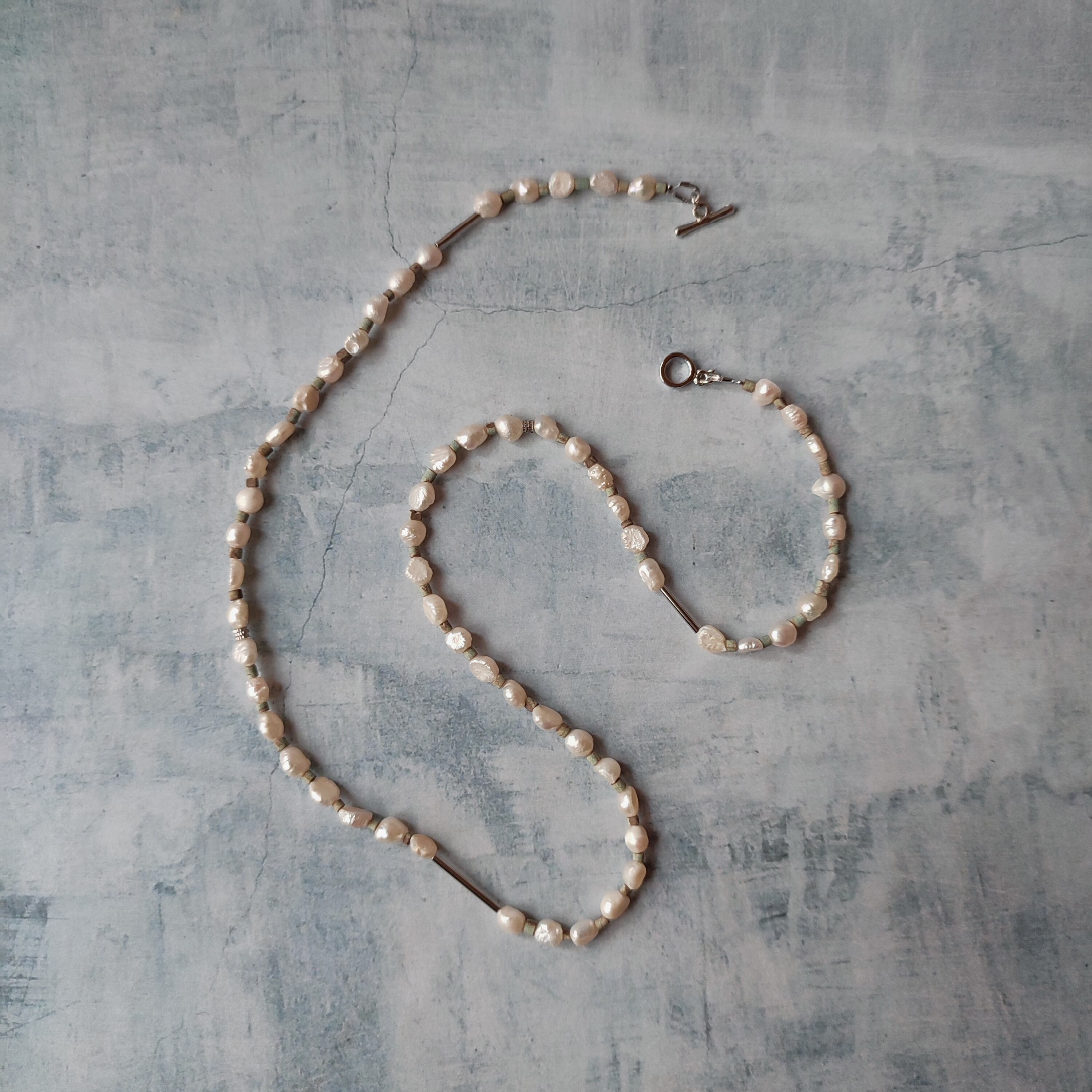 いびつな形が魅力の小さな淡水パールをつないだショートネックレスです。