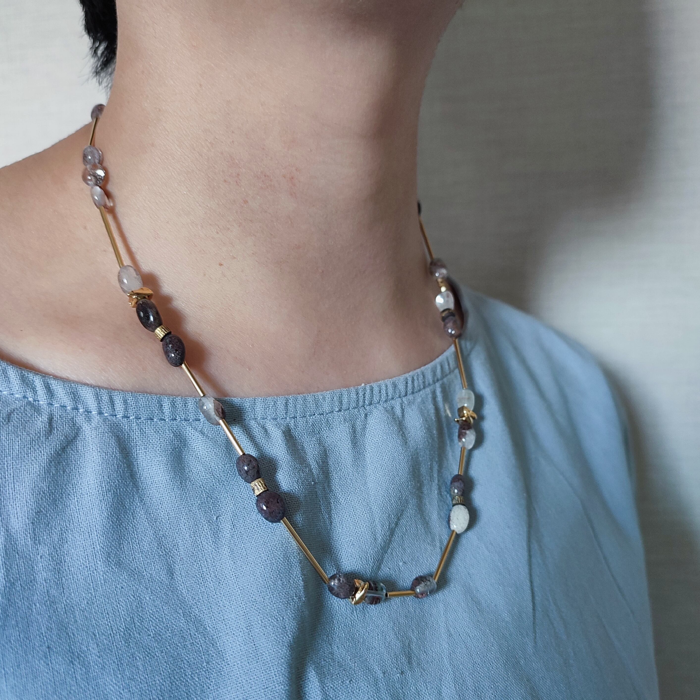 天然石の間には、様々な形のゴールド、ブラックのモチーフをとどめ