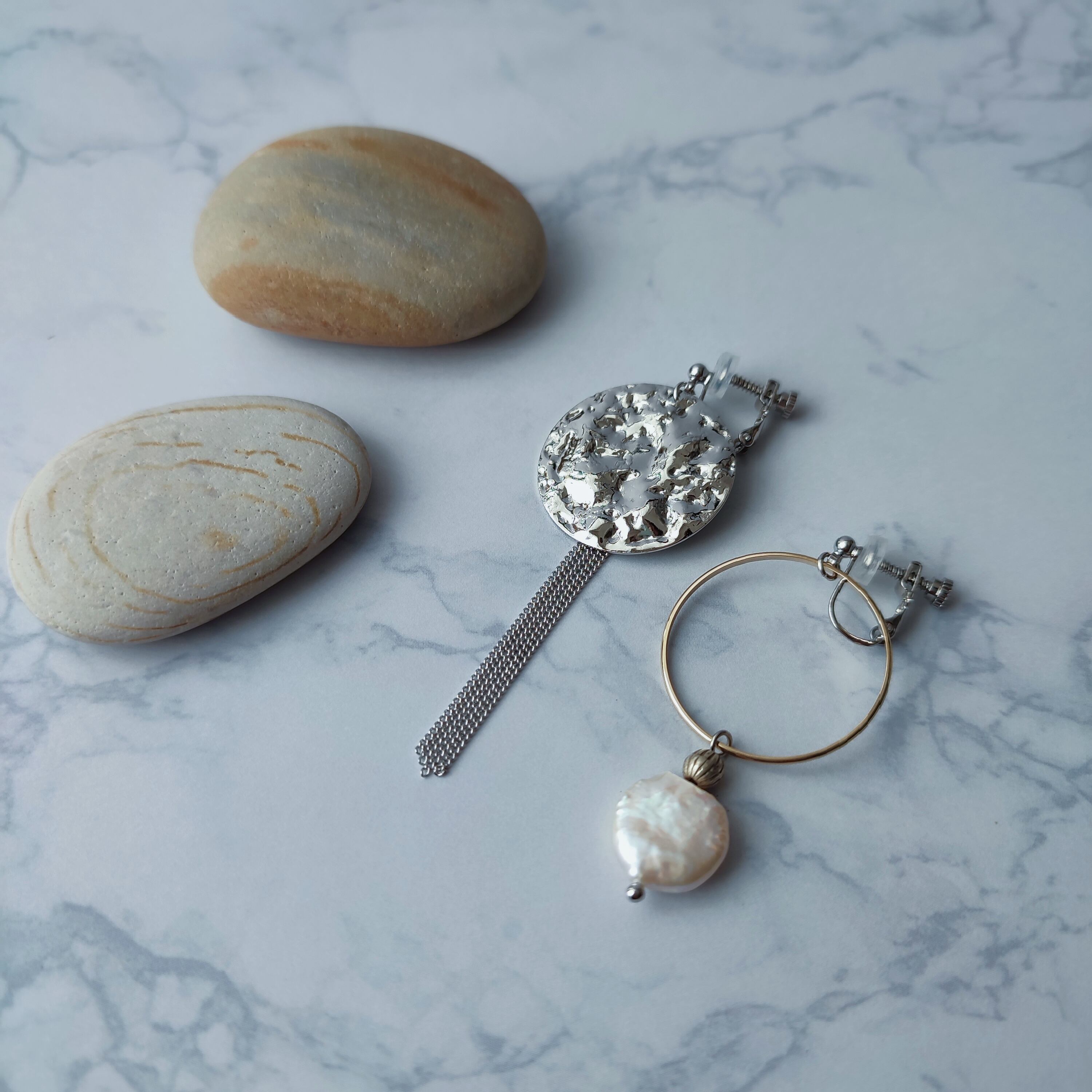 見え隠れする2つの月をイメージして製作したアシンメトリーなイヤリングです。