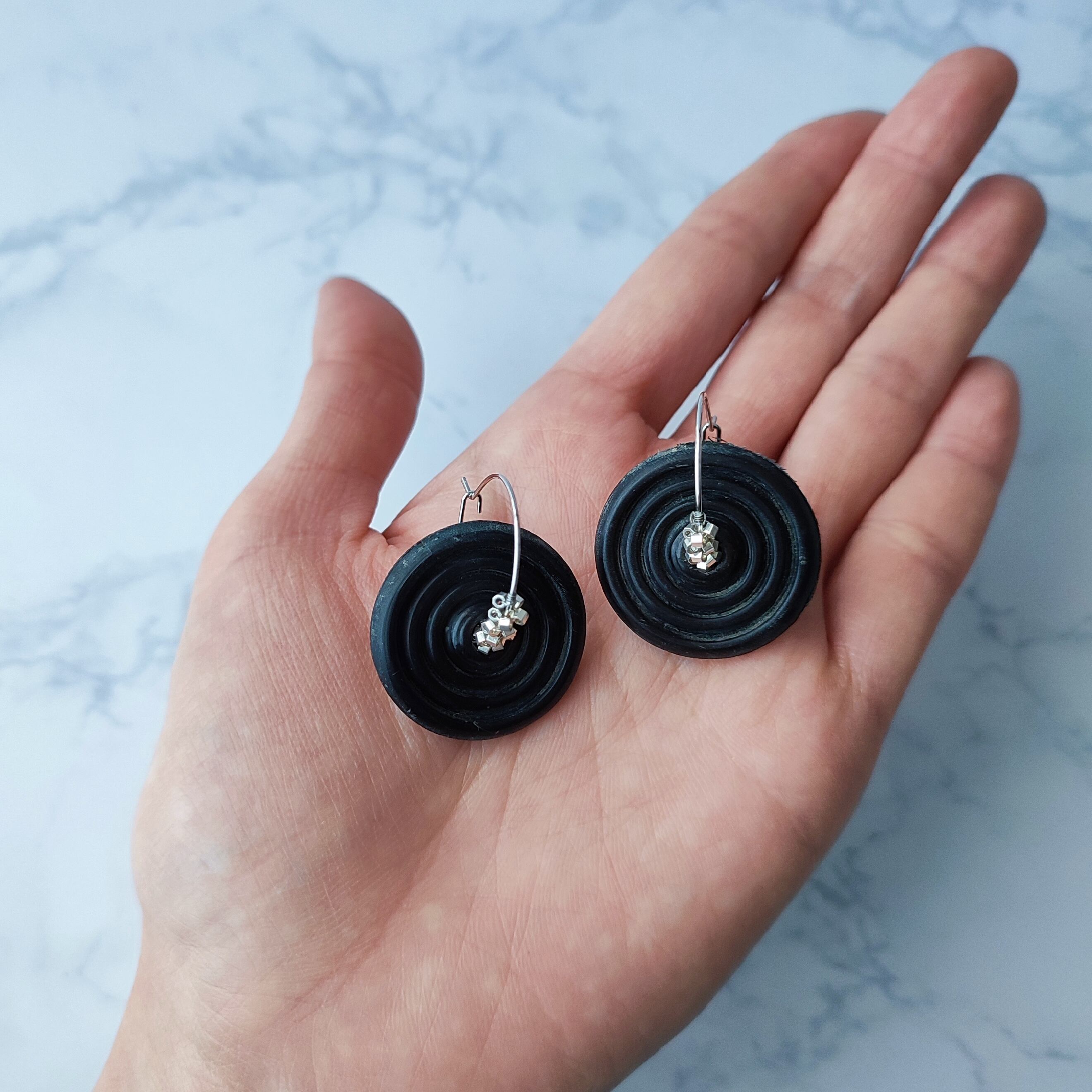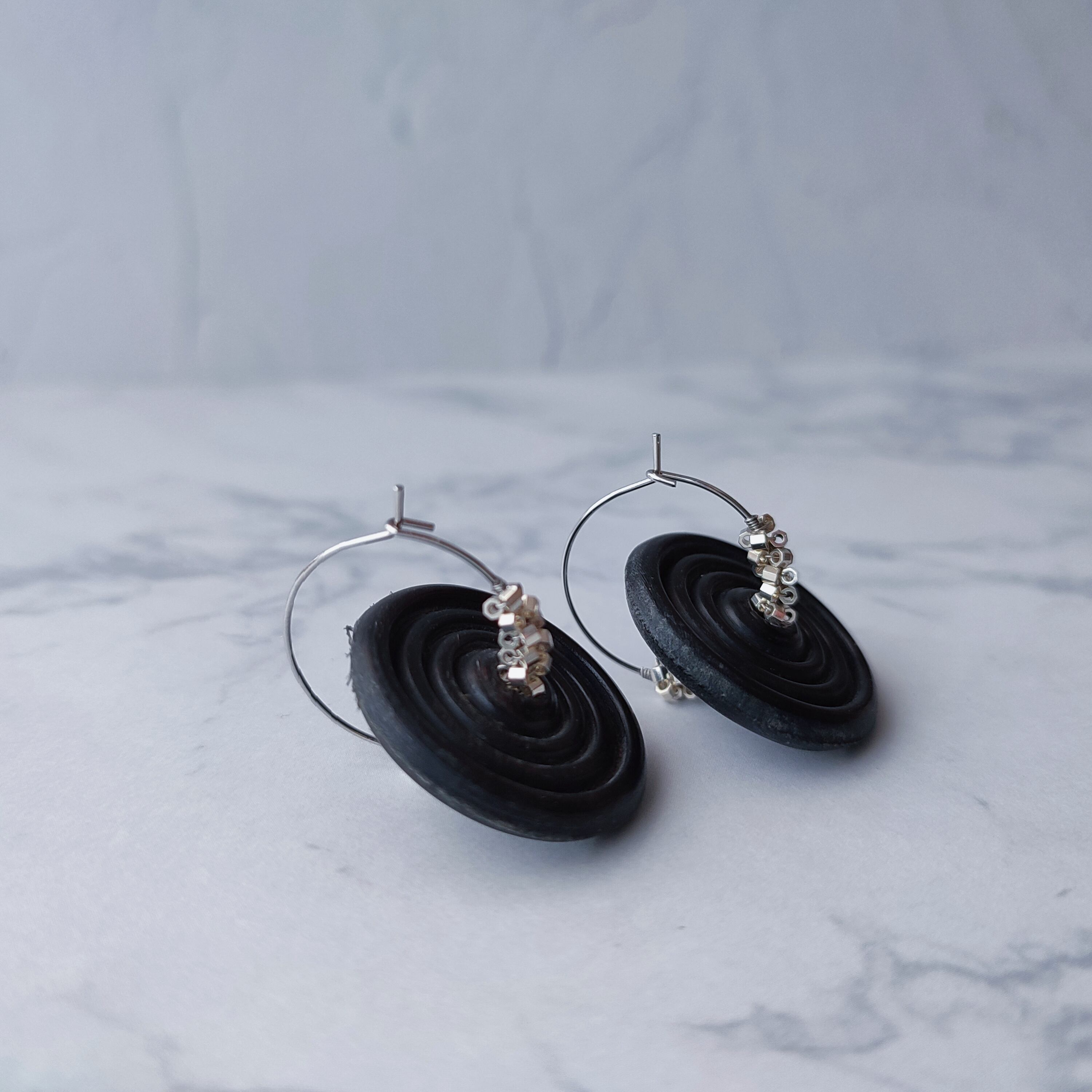 渦巻状に彫られた黒い円は水牛の角から作られたもので