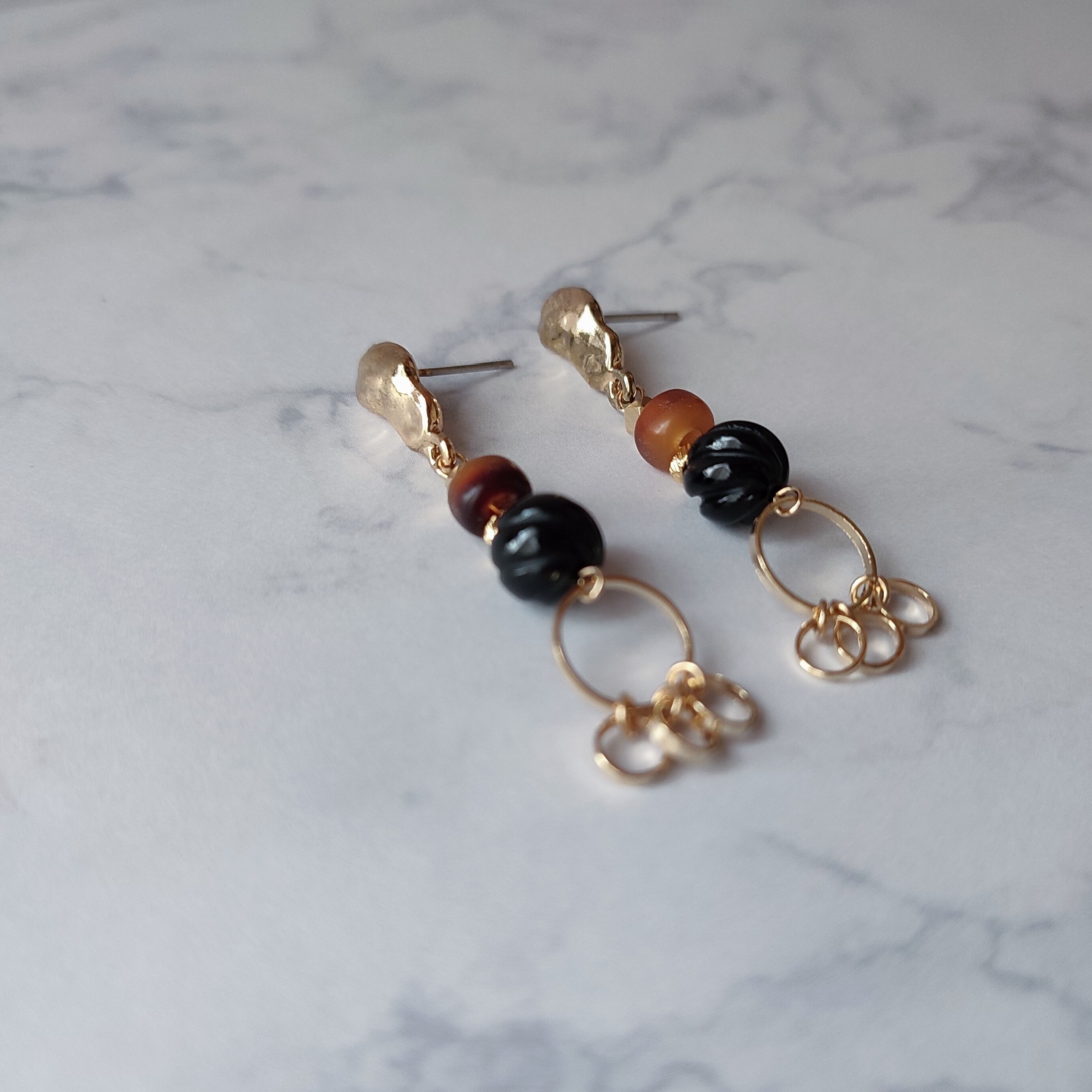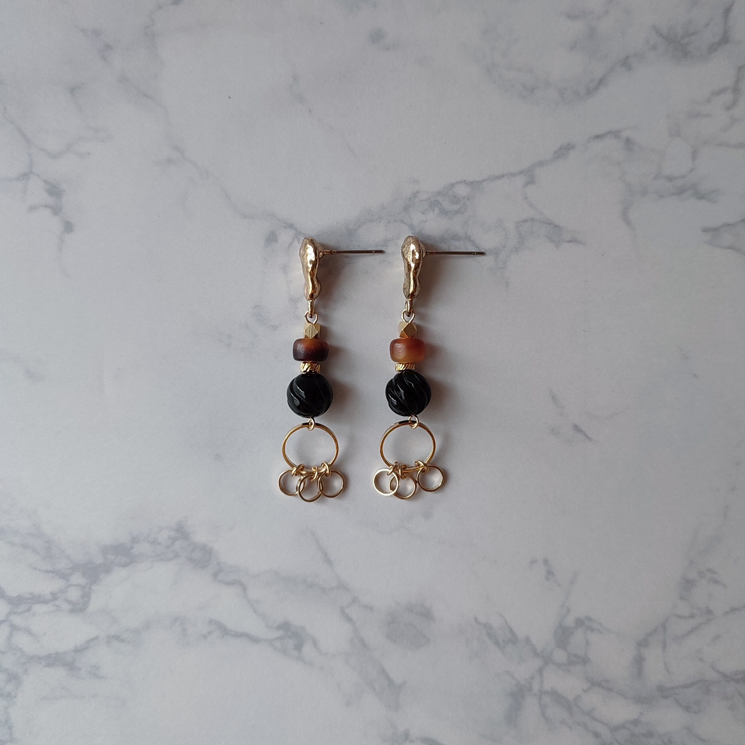 つやのあるオニキスを組み合わせた縦長ピアスです。