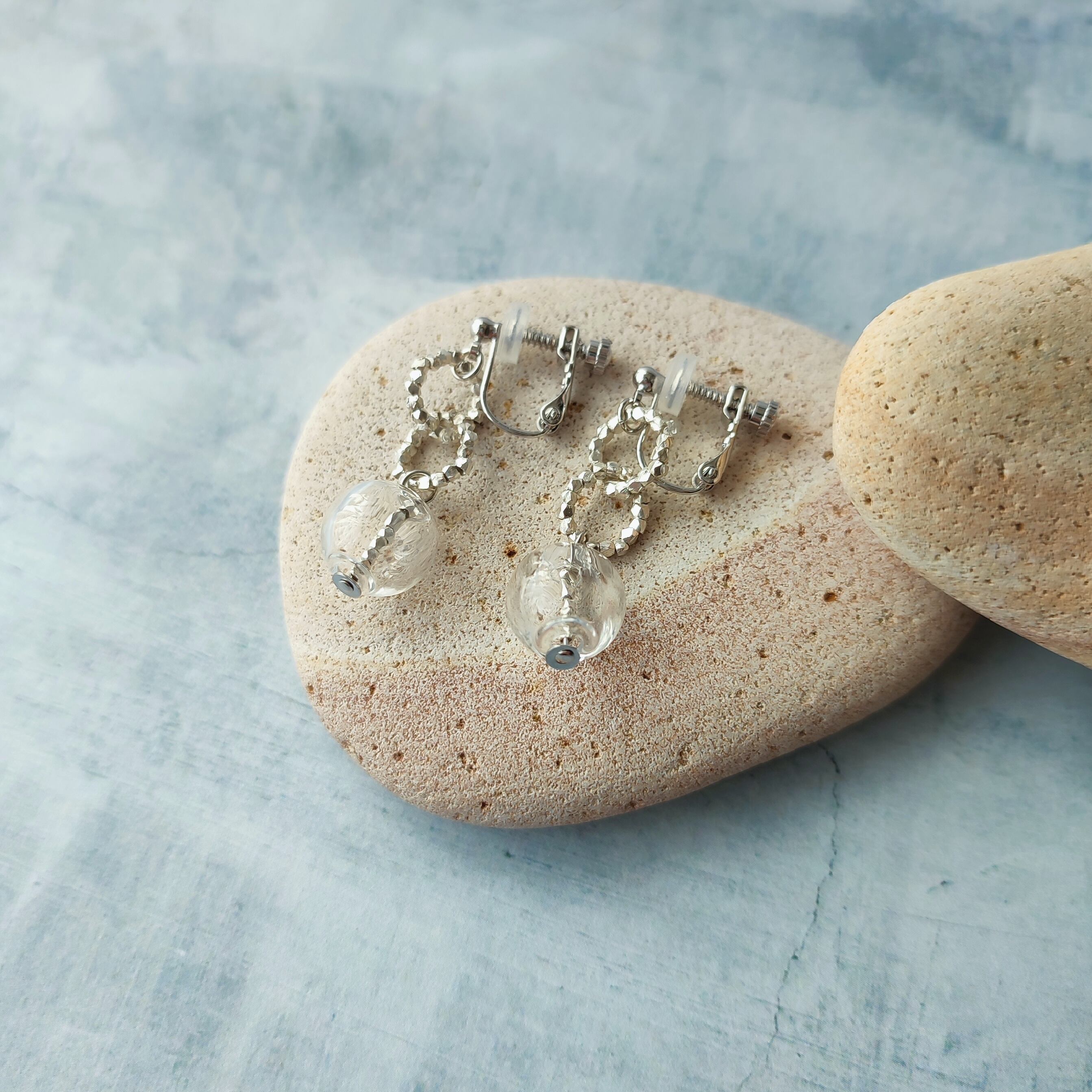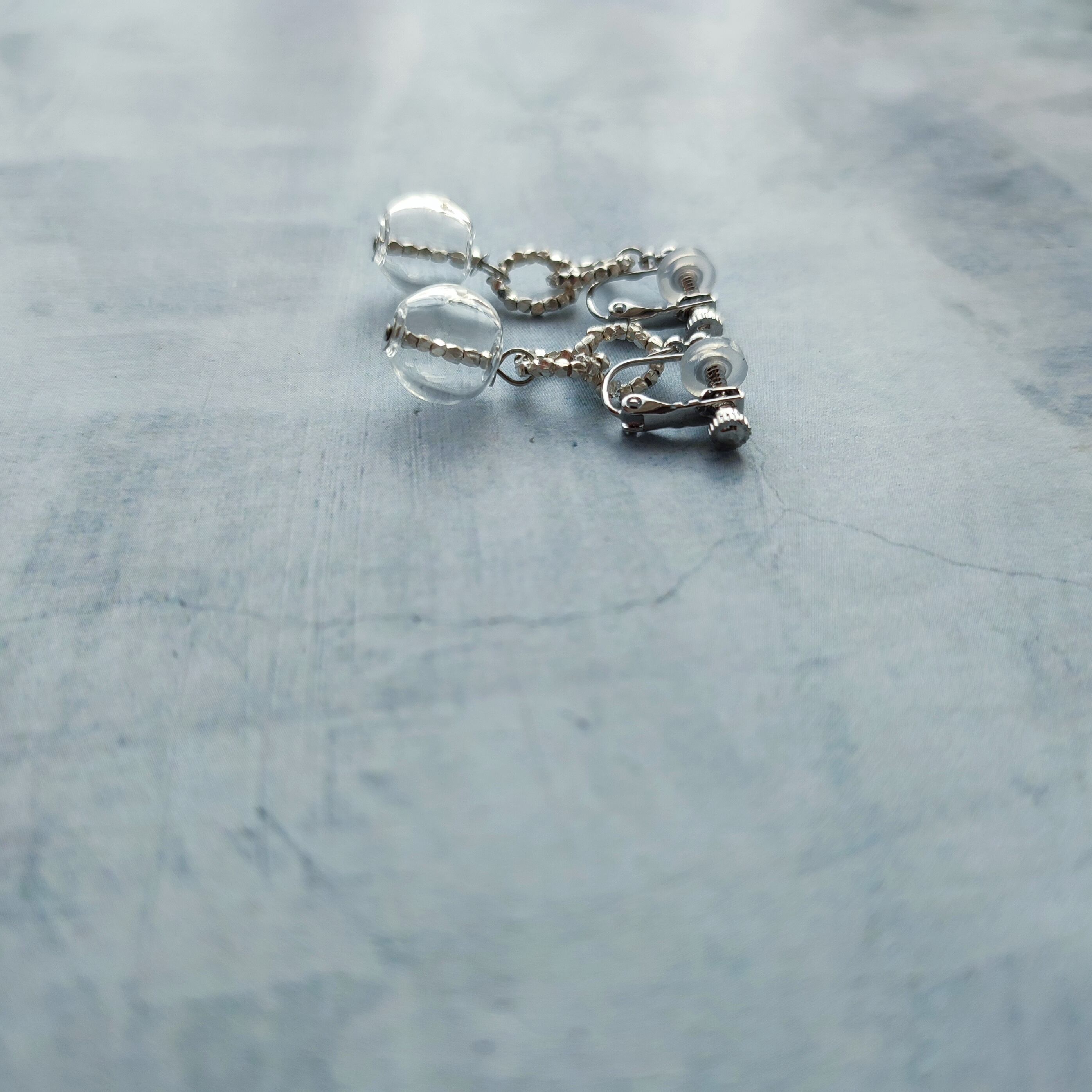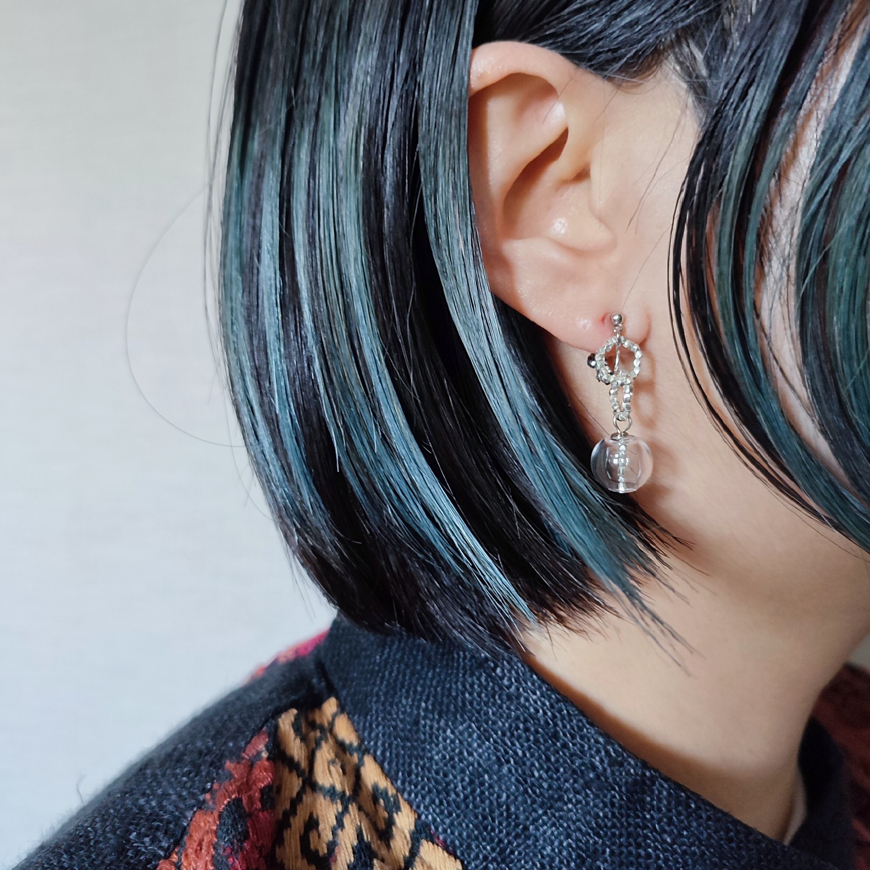 小さなカレンシルバーの粒と、水泡のような透明なガラスで製作したイヤリングです。