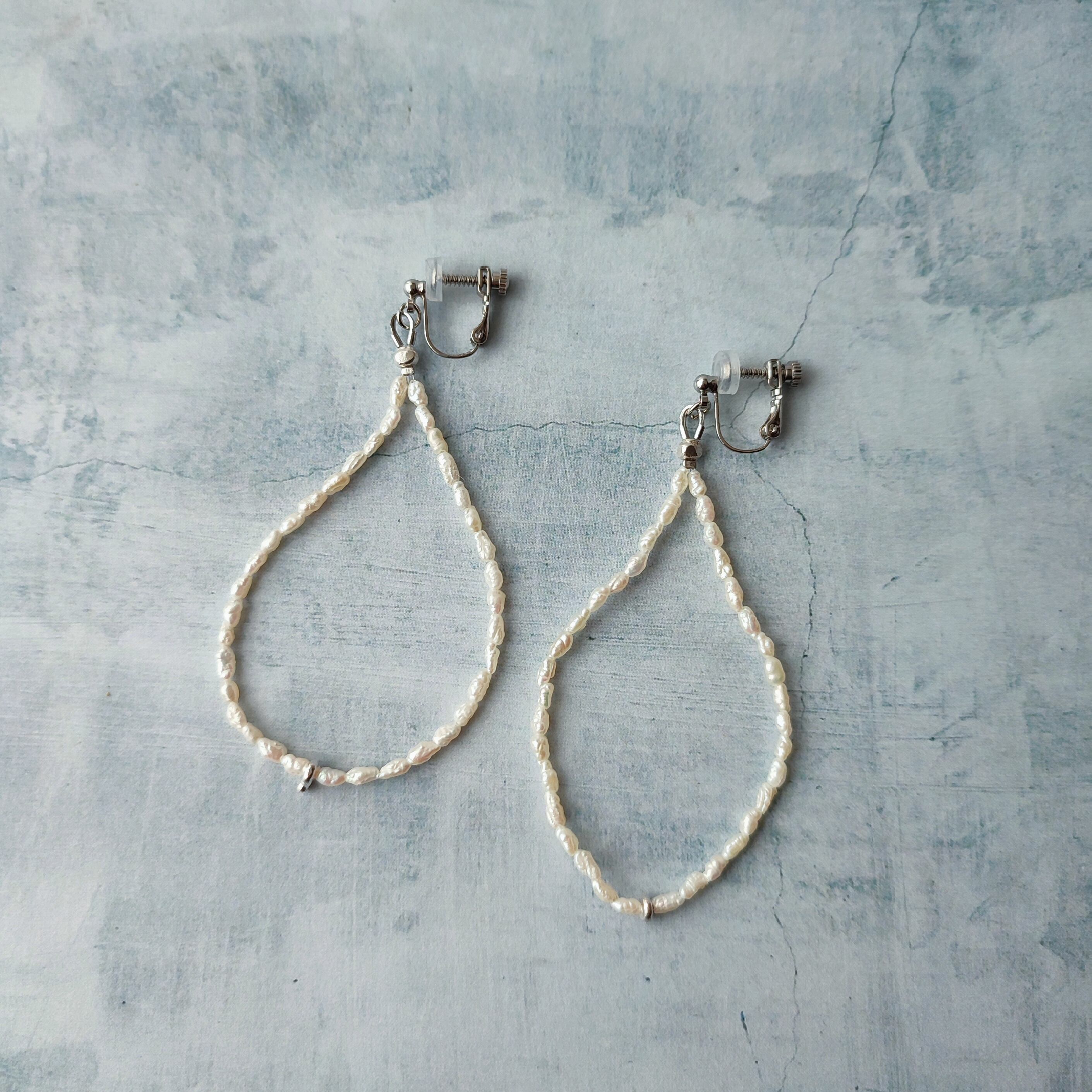 柔らかな印象の淡水パールとカレンシルバーの粒で、露の形をした耳かざりを製作しました。