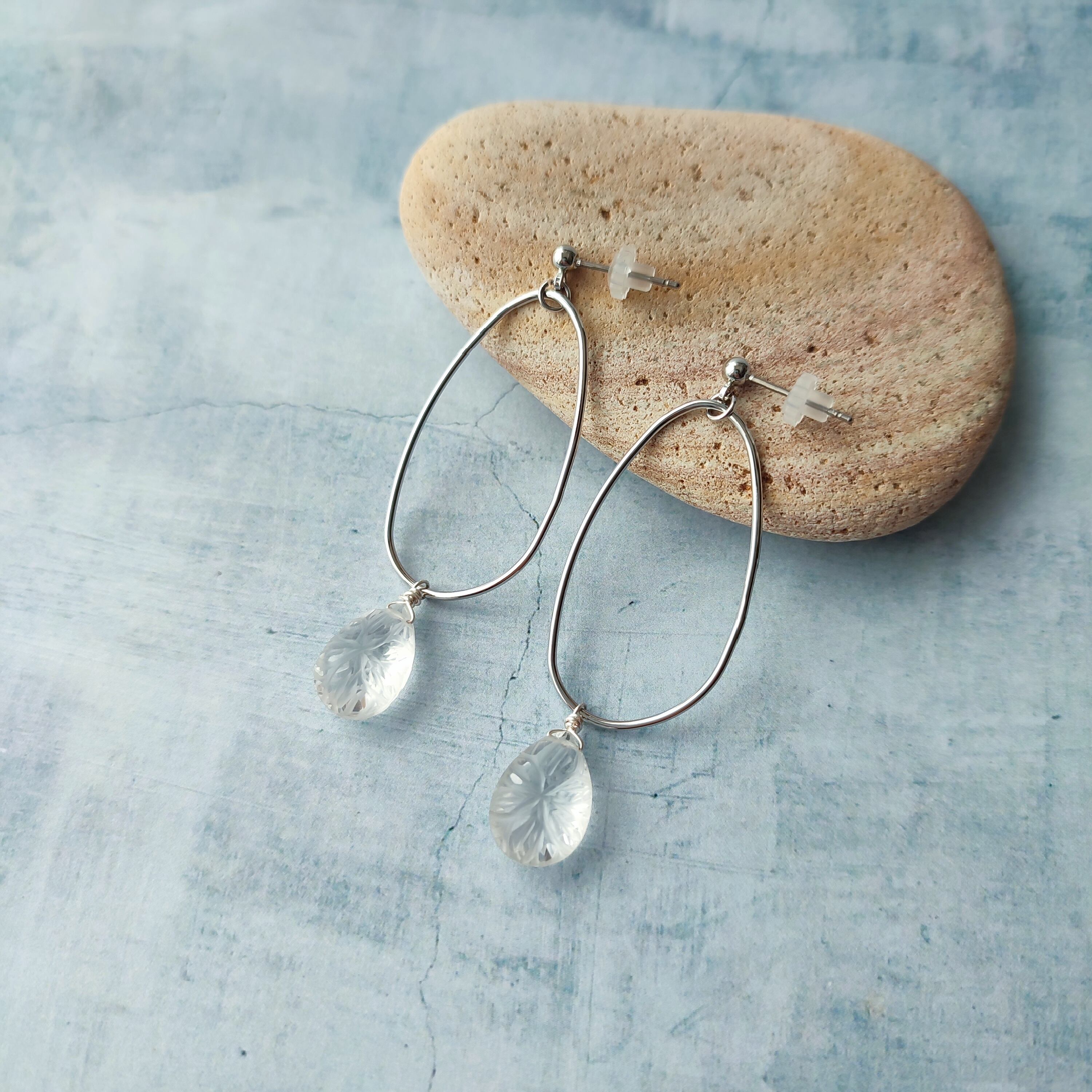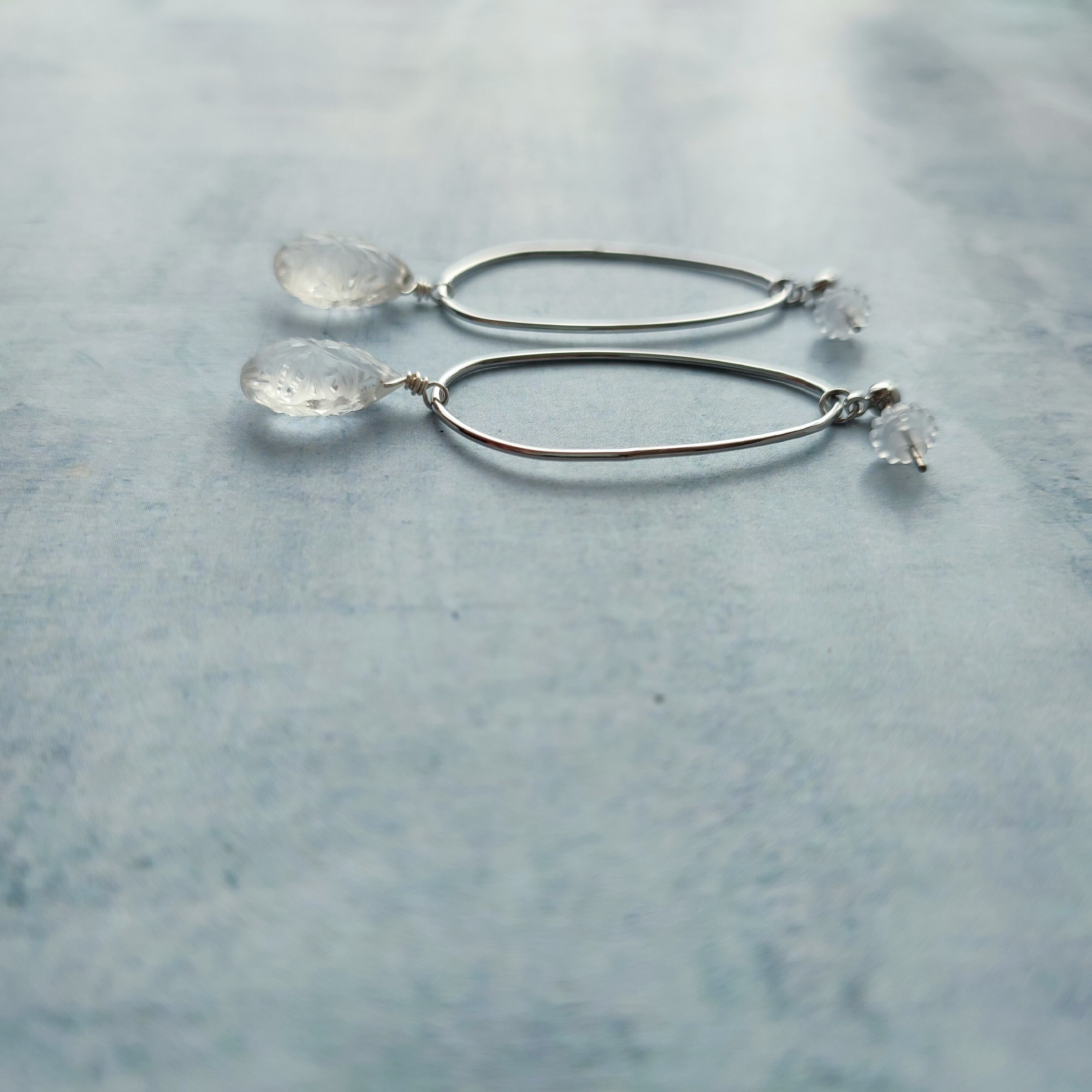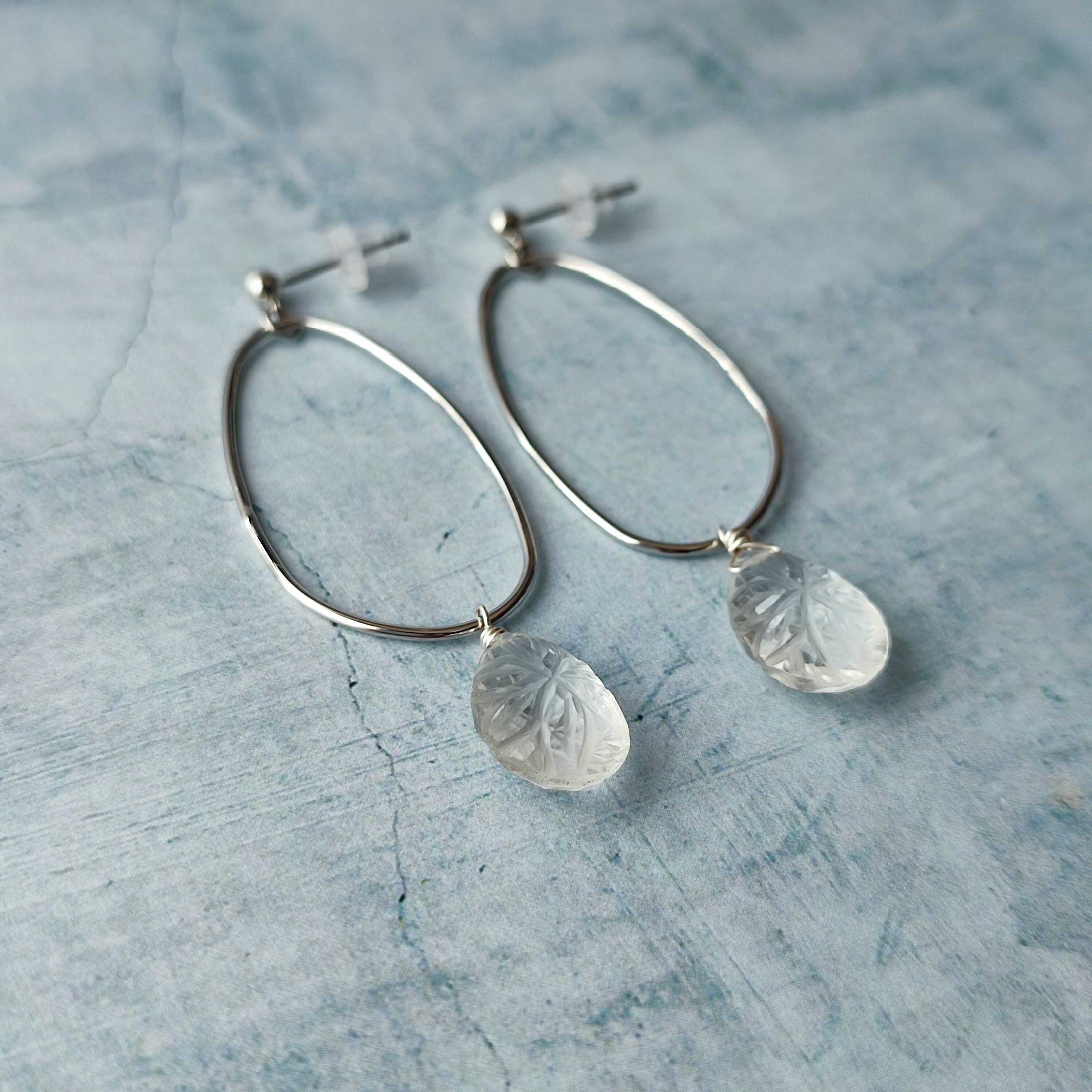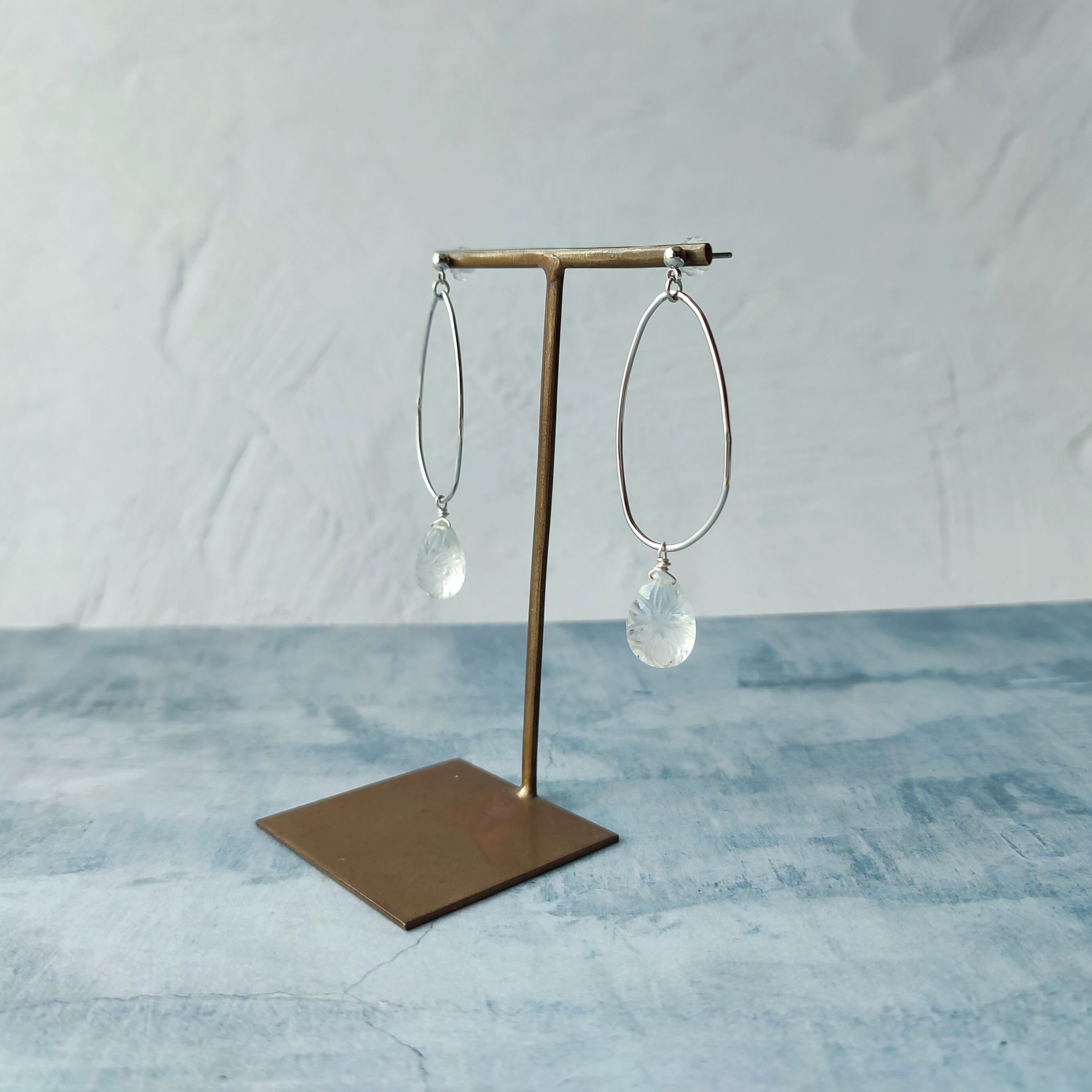透き通る水晶に花の彫刻が施されたしずくが軽やかにそよぐピアスです。