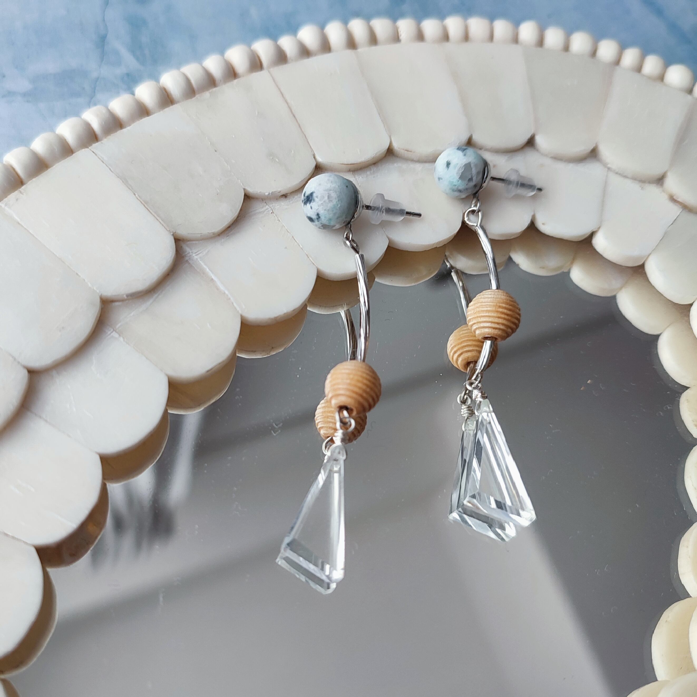 水辺を思わせる淡い水色のセサミジャスパーと光を閃かせる透明な水晶を主役にしたピアスです。