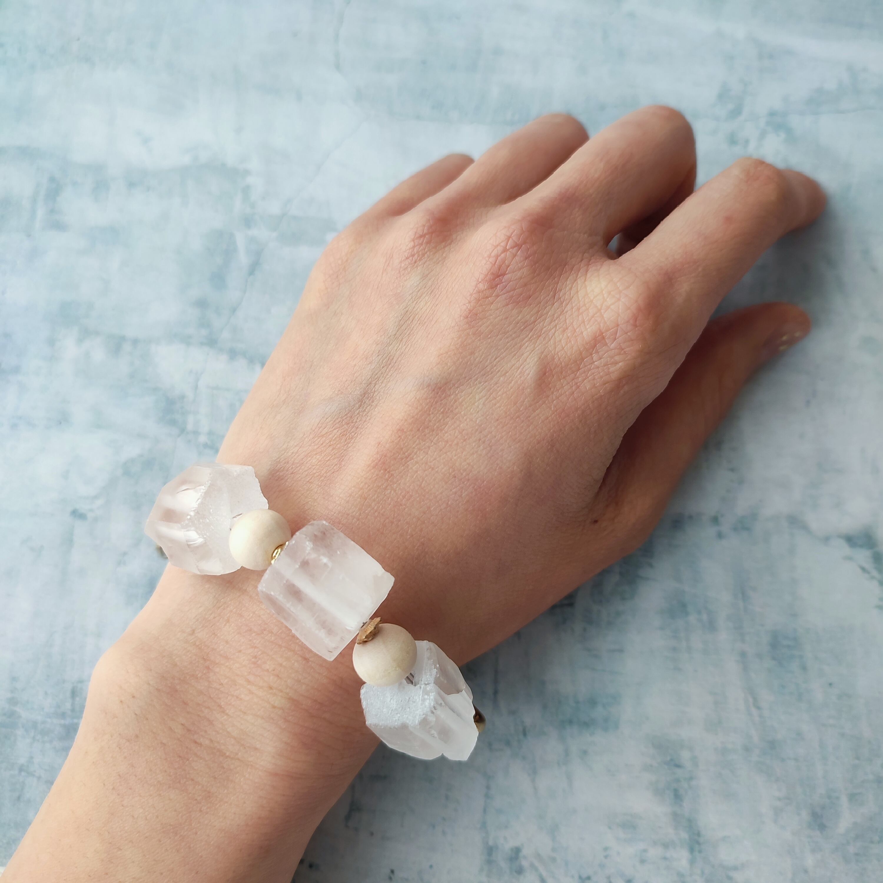 ひんやりと冷たい氷の塊を思わせる、大きな水晶の粒を使用し