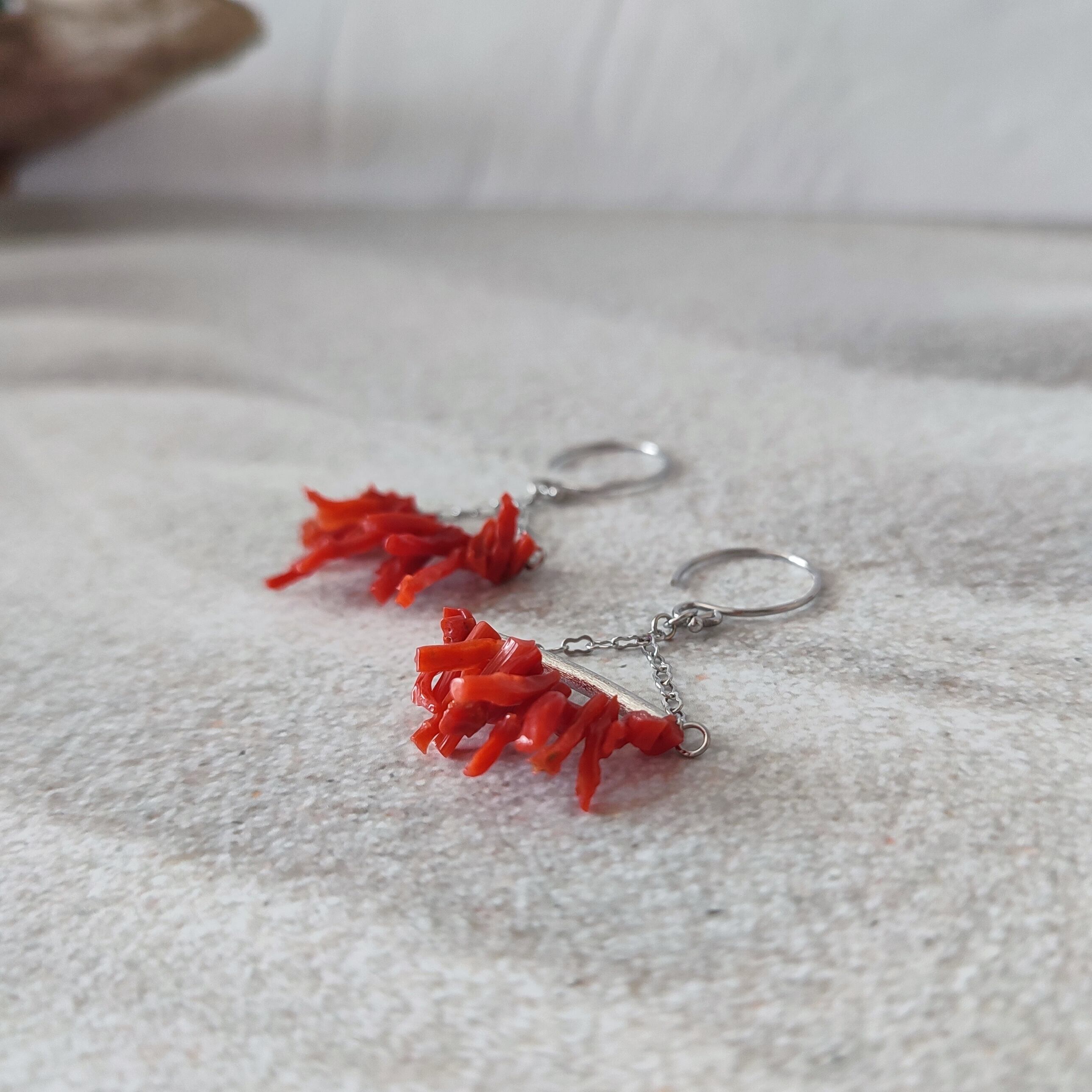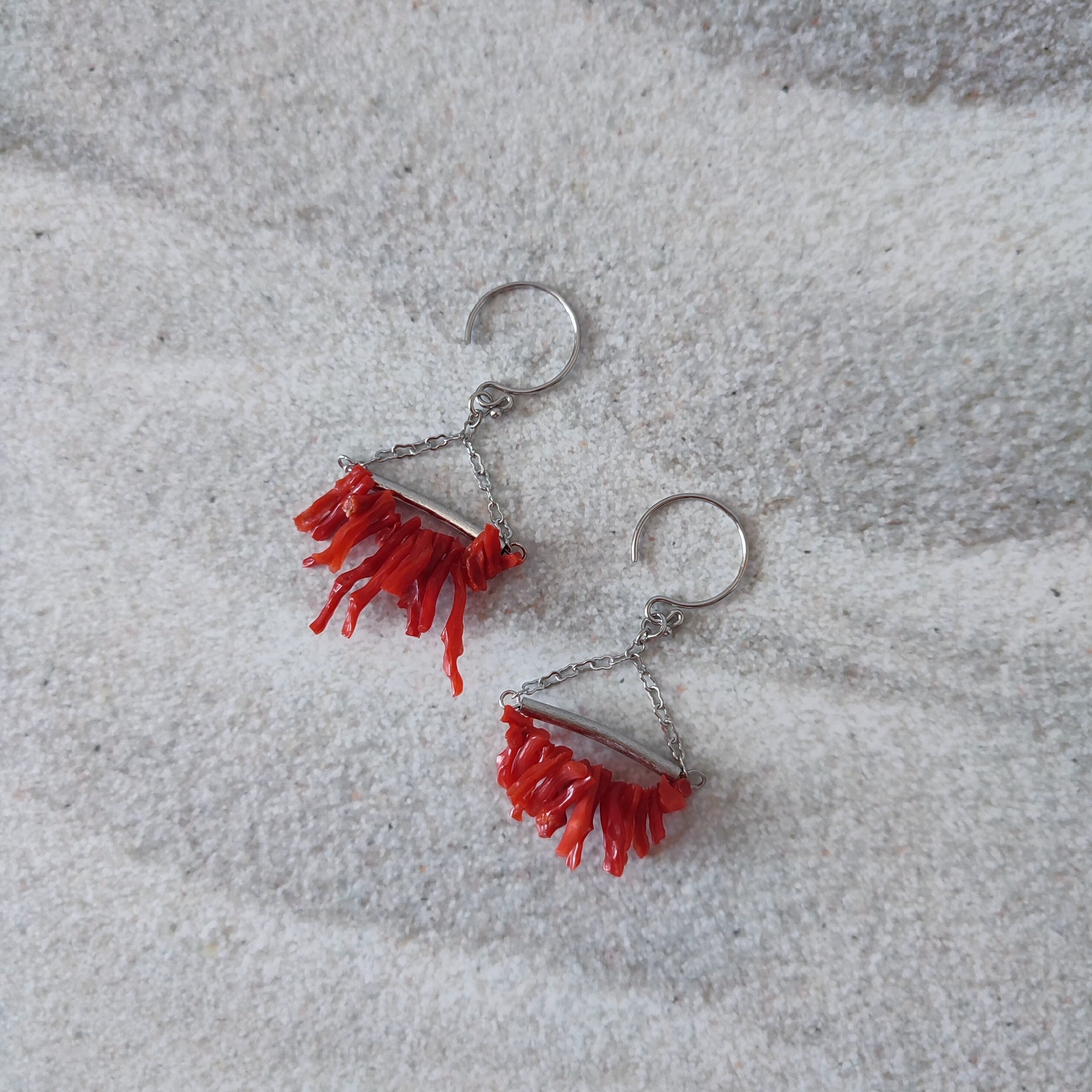 枝の形をした本珊瑚が連なり、鮮やかな印象を作り上げるピアスです。