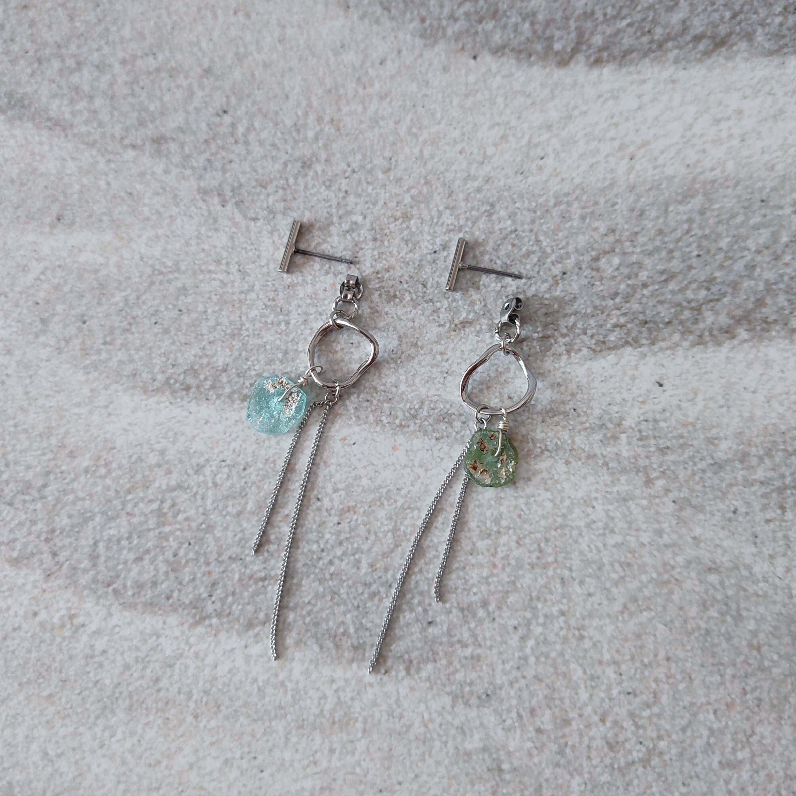 キャッチに取り付けたローマングラスと繊細なチェーンが耳の後ろから揺れるデザインです。