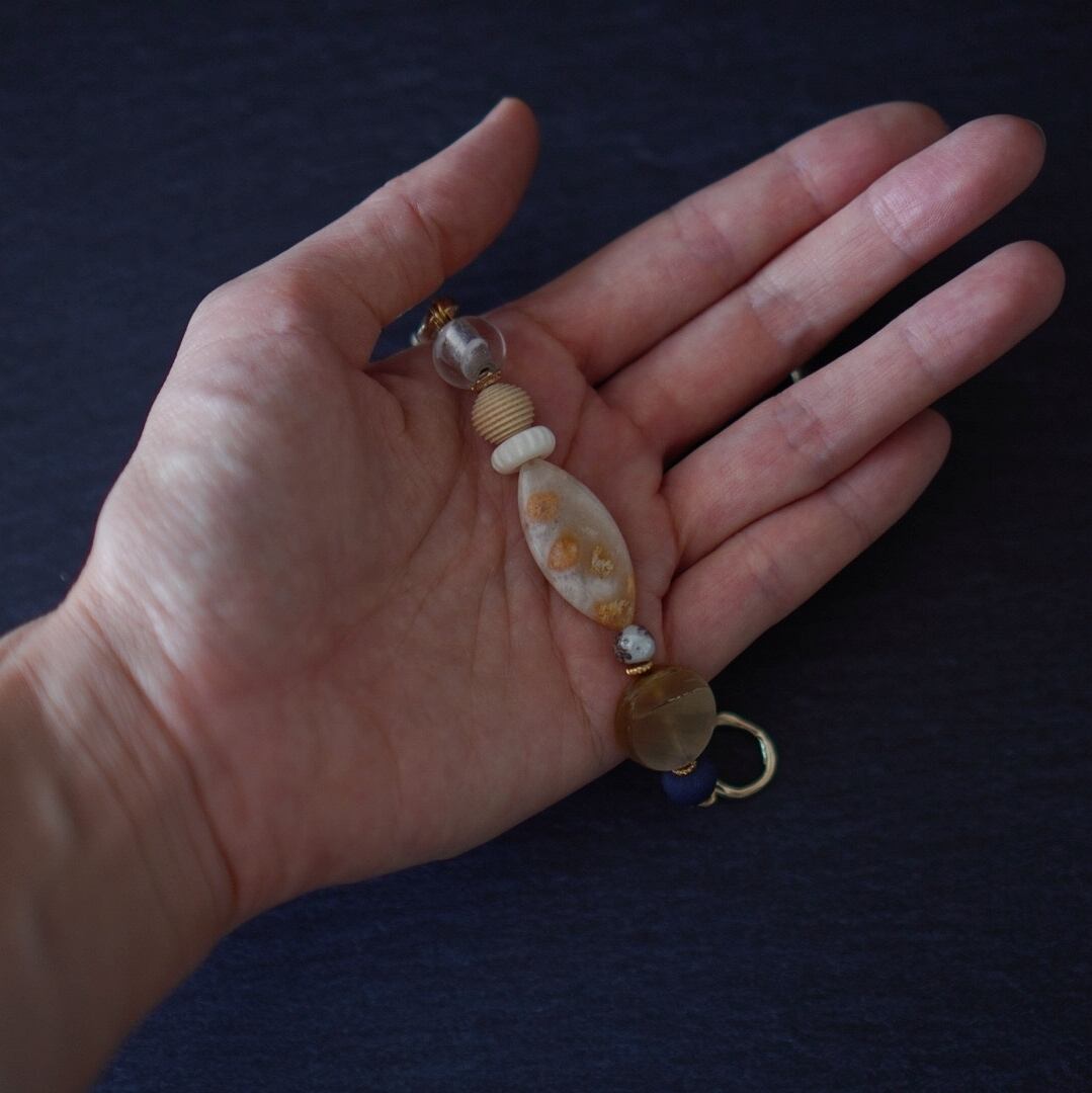 自然の美しさを秘めた素材を使用して製作したマンテルで留めるタイプのブレスレットです。