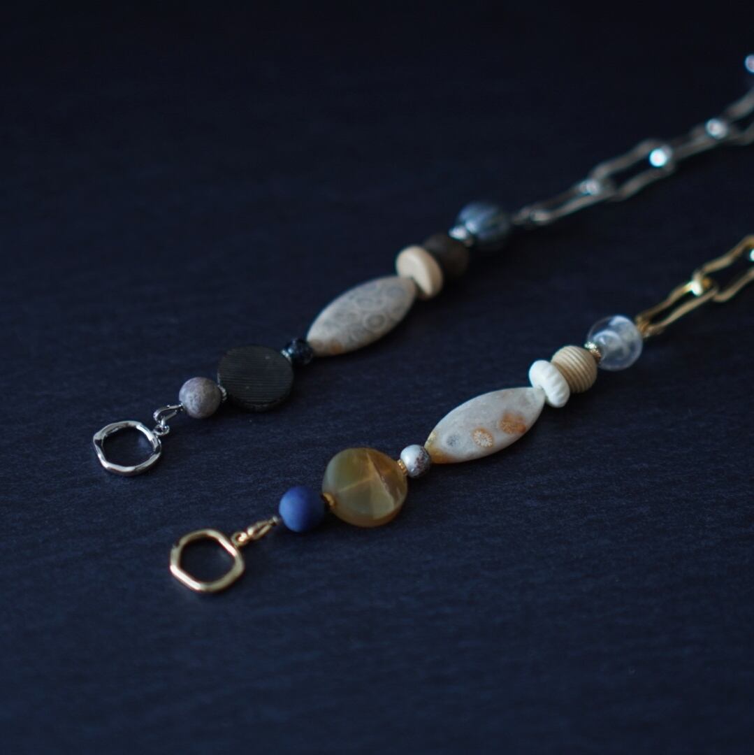 さらさらとした天然石や、焼き物、水牛の角や珊瑚の化石など